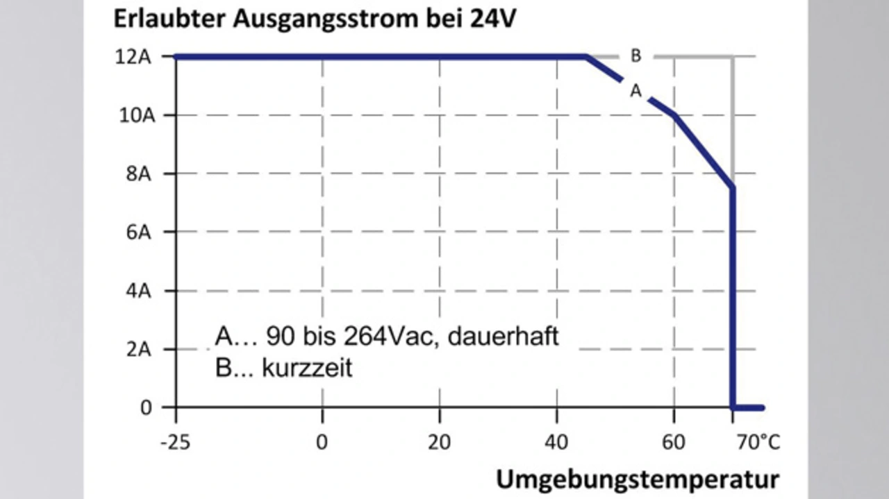 Insbesondere bei Outdoor-Anwendungen ist ein weiter Temperaturbereich sehr interessant. Dort müssen Geräte auch bei sehr niedrigen Temperaturen sicher anlaufen und müssen voll belastet werden können. Bei passiver Einschaltstrombegrenzung und niedrigen Temperaturen verursachen Lastsprünge von Niedriglast auf Volllast oft Probleme. Bei der CPS10 stehen die vollen 240 W in einem Temperaturbereich von -25 °C bis +60 °C zur Verfügung (Bild 5). Zwischen +60°C und +70°C ist eine Leistungsrücknahme von 6 W/K notwendig. Die 20% Bonus-Power, was einer Ausgangsleistung von fast 290 W entspricht, stehen bis +40 °C Umgebungstemperatur sogar dauerhaft zur Verfügung.