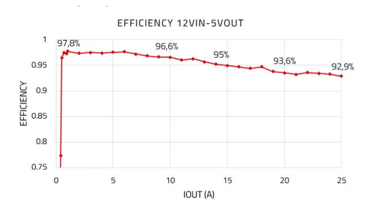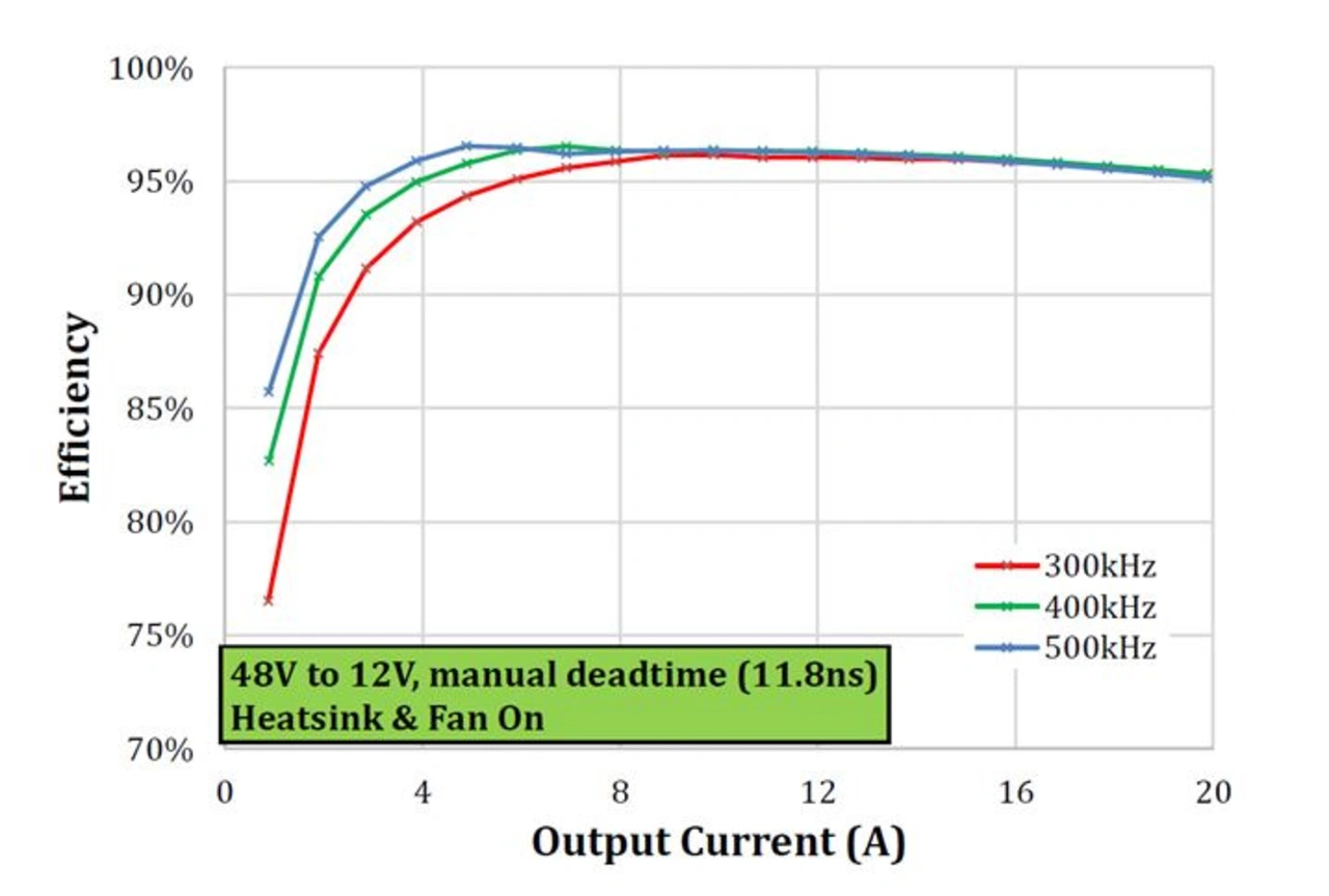 »Wir haben verschiedene Wandler mit Wide-Band-Gap-Bauelementen realisiert und hatten die Möglichkeit, die Vorteile dieser Bauelemente zu testen. So haben wir zum Beispiel einen 48-V-Bus-DC/DC-Wandler auf der Basis von GaN-Bauelementen mit bis zu 20 A am Ausgang entwickelt. Außerdem haben wir einen weiteren 24-V-Bus-Abwärts-Gleichstromwandler auf GaN-Basis mit bis zu 25 A am Ausgang entwickelt«, erklärt Shousha. Abbildung 1 zeigt den Wirkungsgrad eines 48-V-Bus-Wandlers, bei dem Wirkungsgrade von über 95 % erreicht werden können. Abbildung 2 zeigt den Wirkungsgrad eines 24-V-Bus-Wandlers, bei dem ein Wirkungsgrad von 98 % erreicht wird.