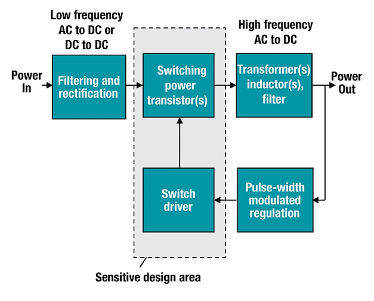 Den prinzipiellen Aufbau eines Schaltnetzteils zeigt Bild 1. Die eingangsseitige Spannung – oft handelt es sich um eine hohe Wechselspannung mit niedriger Frequenz – wird gleichgerichtet. Netzfilter verhindern, dass die im Netzteil entstehenden hohen Frequenzen in das Netz gelangen. Herzstück des Schaltnetzteils ist der mit hoher Frequenz schaltende Leistungsschalter, der die Gleichspannung in eine gepulste Spannung verwandelt. Der Ausgang des Schalters wird in die benötigte Spannung umgewandelt und so gefiltert, dass eine gleichmäßige Spannung entsteht, deren Höhe auf den Bedarf des versorgten Systems abgestimmt ist. Vom Ausgang wird ein Signal an den Regler zurückgeführt. Dieser erzeugt ein pulsweitenmoduliertes (PWM-) Signal für den Treiber, der wiederum den Leistungsschalter ansteuert. Je nach der Belastung des Ausgangs wird die Pulsweite dieses Treibersignals erhöht oder verringert.