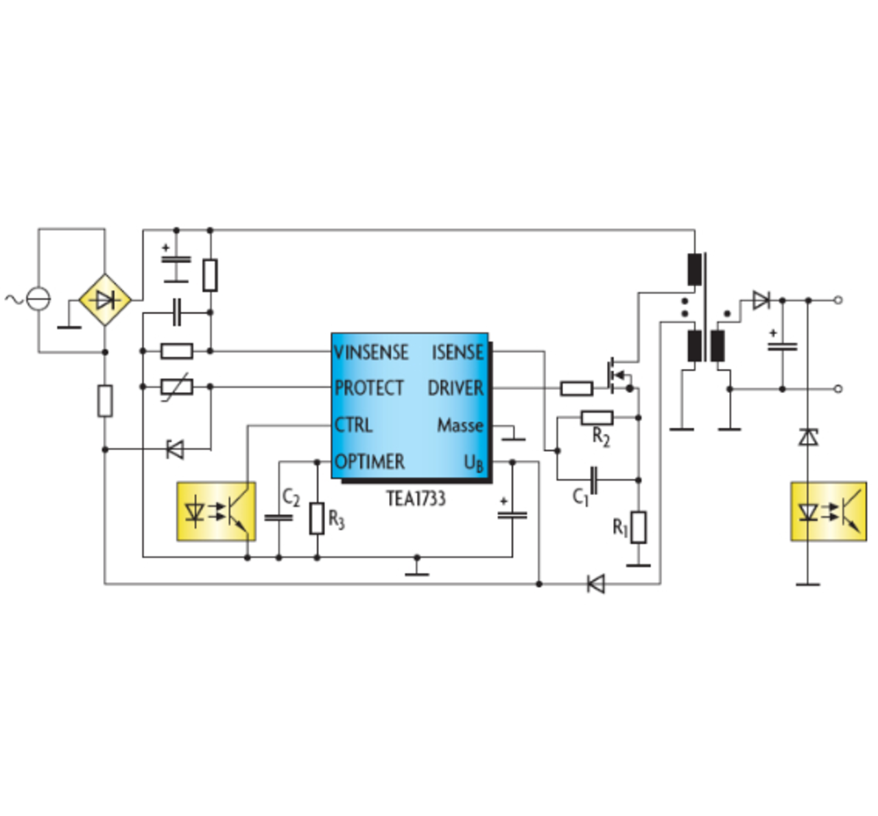 Sperrwandler sind heute der am weitesten verbreitete Schaltnetzteiltyp. Die typische Beschaltung des TEA-1733 in einer Sperrwandler-Schaltung zeigt Bild 1. Der TEA1733 arbeitet mit der Spitzenstromregelung, und die Regelung der Ausgangsleistung erfolgt über den „CTRL“-Pin. Die Information über die am Ausgang gemessene Last wird per Optokoppler an den „CTRL“-Eingang zurückgeführt.