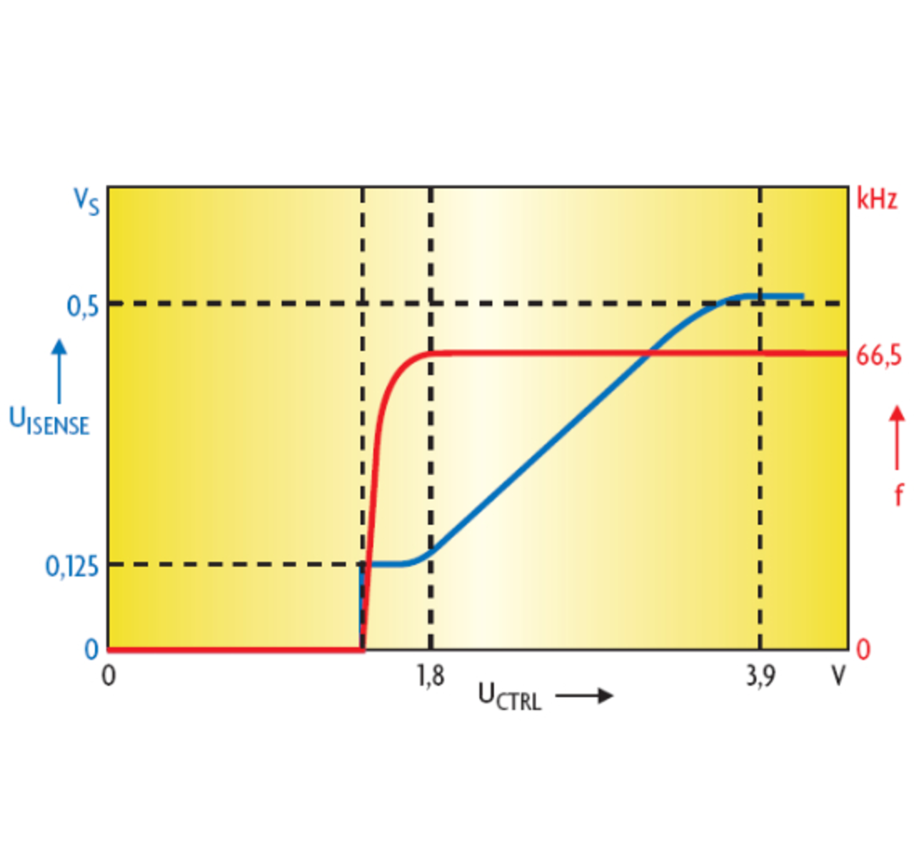 Der Verlauf von Spitzenstrom – erfasst über den ISENSE-Anschluss als Spannung über dem Strommesswiderstand – und Schaltfrequenz als Funktion der Spannung am „CTRL“-Eingang ist in Bild 2 wiedergegeben.