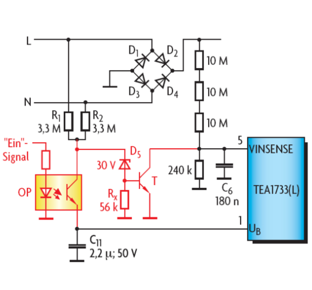 Im Bereitschaftsbetrieb („Low“-Pegel) sperrt der Fototransistor im Optokoppler Ux so dass der Transistor Tx leitend wird und die Spannung am Anschluss „VINSENSE“ nach unten ziehen kann. Dadurch wird ein Neustart der Schaltung unterbunden. Das IC stellt daraufhin das Schalten ein und wechselt in den „Power-Down“-Modus, in dem es nur noch einen Strom von 10 μA aufnimmt. Die Betriebsspannng UB wird in diesem Modus auf einen Wert knapp unter der Einschalt-Spannungsschwelle begrenzt, damit das IC schnell aus dem Bereitschaftsbetrieb in den Normalbetrieb gesteuert werden kann.