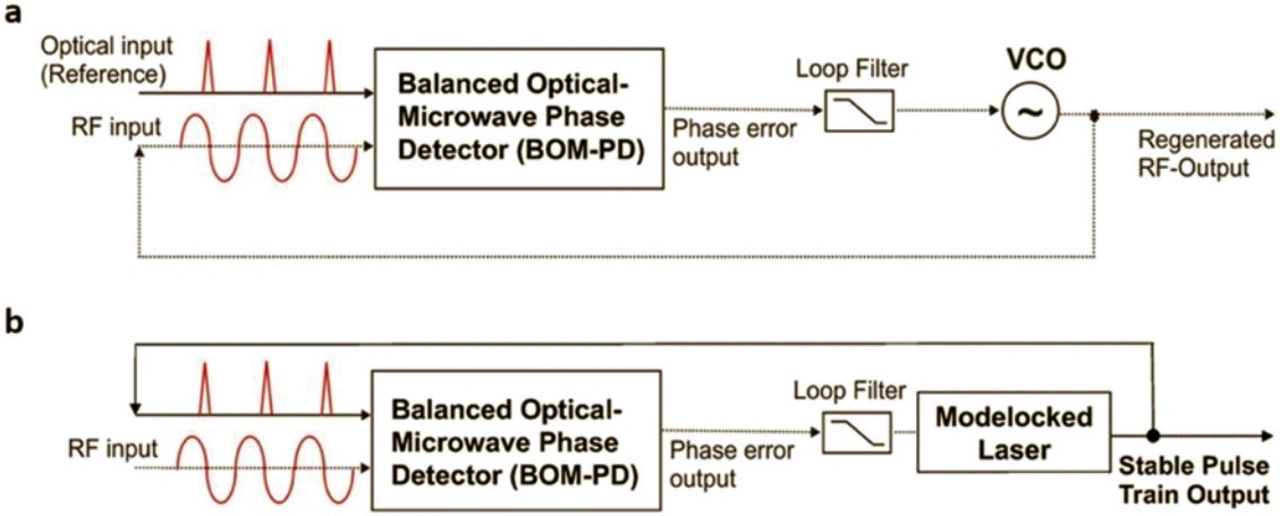 Die Lichtimpulse aus dem Ultrakurzpulslaser werden in zwei Arme aufgeteilt und in Amplitudenmodulatoren geleitet, die von der Mikrowellenquelle angetrieben werden. Der Phasenfehler wird in ein Intensitätsungleichgewicht der geteilten Strahlen umgewandelt und von einem Gegentakt-Photodetektor erfasst – das Fehlersignal zur Stabilisierung des VCO oder Lasers (Abbildung 1).