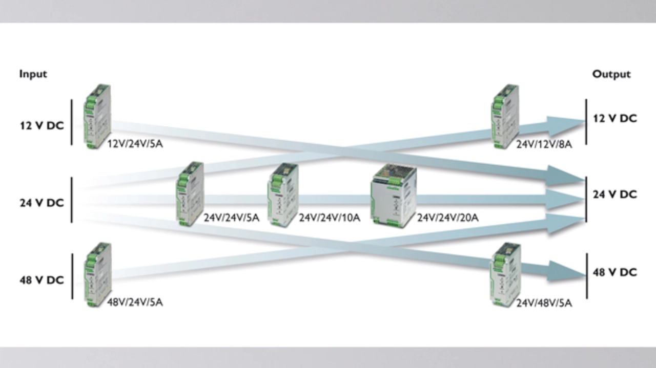 Als Nenneingangsspannung stehen neben 24 V auch 12 V und 48 V zur Verfügung (Bild 1). Dabei liefern die Geräte Nennströme von 5 A bis 20 A. Aufgrund der galvanischen Isolation sind die Stromkreise voneinander getrennt und sensible Verbraucher durch deren Entkopplung geschützt. In die primär getakteten Schaltwandler ist ein interner Zwischenkreis integriert, der als Filter dient. So lassen sich beispielsweise geerdete von ungeerdeten Stromkreisen separieren.