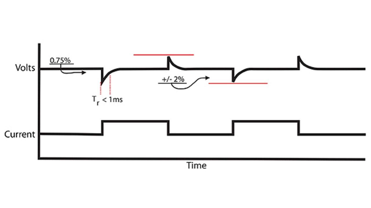 Eine wichtige Spezifikation für viele Anwendungen ist das Einschwingverhalten. Es gibt an, wie gut ein Netzteil auf Änderungen des Strombedarfs bzw. der Lastimpedanz reagiert. Wenn die Stromaufnahme des Verbrauchers in kurzer Zeit stark fällt oder zunimmt, kann die Ausgangsspannung entsprechend deutlich steigen oder fallen, da die interne Regelung des Netzteils nicht in der Lage ist, verzögerungsfrei auf diese Änderungen zu reagieren.