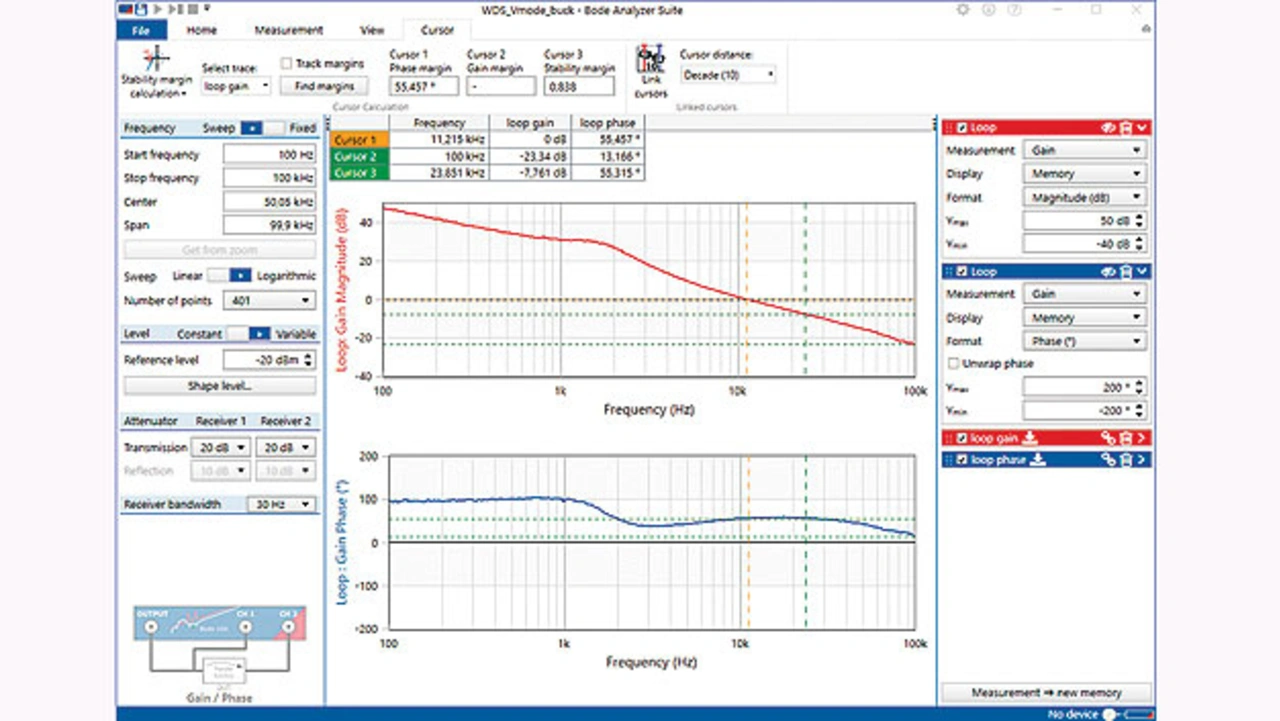 Bild 2 zeigt ein Bode-Diagramm mit echten Messdaten eines spannungsgesteuerten Abwärtswandlers. Das Netzteil wurde mithilfe des Frequenzganganalysegeräts Bode 100 von Omicron Lab vermessen. Es weist eine Durchtrittsfrequenz von 11,2 kHz auf. Es handelt es sich um jene Frequenz, bei der der Amplitudengang die 0-dB-Achse schneidet. Die Schaltfrequenz des Netzteils liegt bei 200 kHz. Somit beträgt die Durchtrittsfrequenz weniger als ein Zehntel der Schaltfrequenz. Dadurch ist die erste Bedingung, wie oben beschrieben, erfüllt. Die Phasenreserve bei der Frequenz lässt sich im Programm automatisch bestimmen und beträgt 55°. Auch die zweite Bedingung ist also erfüllt, da der Wert über dem Minimum von 45° liegt.