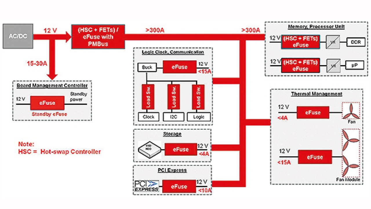 Server sind typischerweise skalierbar und hot-swap-fähig, d. h. Module können bei laufendem Betrieb getauscht und hin- zugefügt werden, um unterschiedlichen Anforderungen an die Verarbeitungsleistung gerecht zu werden und die Systemverfügbarkeit auf einem hohen Niveau zu halten. Um für eine reibungslose Hot-Swap-Funktionalität zu sorgen, werden Server-Motherboards und Stromverteilungs-Boards mit Hot-Swap-Controllern oder eFuses bestückt. Bauteile wie etwa die eFuses, die in Server-Stromversorgungen zum Einsatz kommen, müssen jedoch immer höhere Ströme verkraften, um dem steigenden Leistungsbedarf der Server gerecht zu werden. Außerdem müssen Schutzbausteine wie Hot-Swap-Controller und eFuses für hohe Spitzenströme ausgelegt sein, damit sie zu den deutlich höheren Rechenleistungen der in den Servern eingesetzten, modernen Mikroprozessoren passen.
