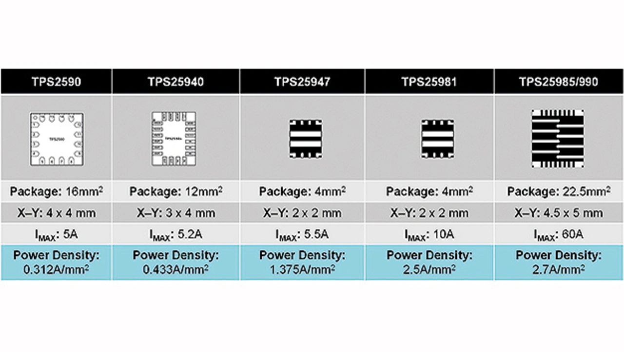 Eine hohe Leistungsdichte ist ein absolutes Muss in modernen Stromversorgungen (Power Supply Units, PSUs) für Server. Die neueste Generation von Server-PSUs ist im Leistungsbereich von 3 kW (250 A bei 12 V) angesiedelt. Bei der Auswahl eines eFuse-Bausteins kommt es darauf an, ein Maximum an Stromtragfähigkeit mit möglichst kleinen Abmessungen zu kombinieren. Der Baustein TPS25985 verkraftet einen Spitzenstrom von 80 A bei einer Gehäusegröße von 4,5 mm x 5 mm. Bild 3 gibt eine Übersicht über einige eFuses von Texas Instruments.