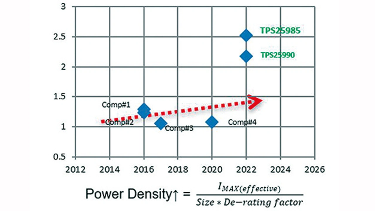 Die eFuses TPS25985 und TPS25990 enthalten jeweils einen MOSFET, einen Stromwächter, einen Komparator, eine aktive Current-Sharing-Struktur und eine Temperaturüberwachung, wodurch sich der Flächenbedarf auf der Leiterplatte signifikant verringert. Werden mehrere eFuses vom Typ TPS25985 oder TPS25990 aneinandergereiht, vervielfachen sich die Flächeneinsparung und die Leistungsdichte entsprechend. Bild 4 vergleicht die Stromdichte der eFuses TPS25985 und TPS25990 mit derjenigen anderer eFuses auf dem Markt.