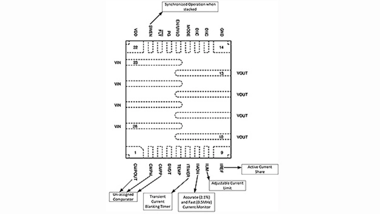 Hot-Swap-Controller sind nicht in der Lage, die Gates mehrerer parallelgeschalteter MOSFETs so exakt anzusteuern, dass eine präzise Aufteilung des Laststroms auf mehrere parallelgeschaltete MOSFETs möglich ist. Die Genauigkeit, mit der der Strom aufgeteilt und überwacht wird, kann zwar durch das Hinzufügen von Präzisionsverstärkern gesteigert werden, aber hierdurch nehmen auch die Abmessungen der Gesamtlösung zu. Da das Messen der Die-Temperatur eines MOSFET eine Herausforderung darstellt, lässt sich der thermische Schutz des Bausteins unter transienten und statischen Bedingungen nicht unbedingt garantieren. In Bild 5 sind wichtige Pins und Funktionen des TPS25985 zu sehen.