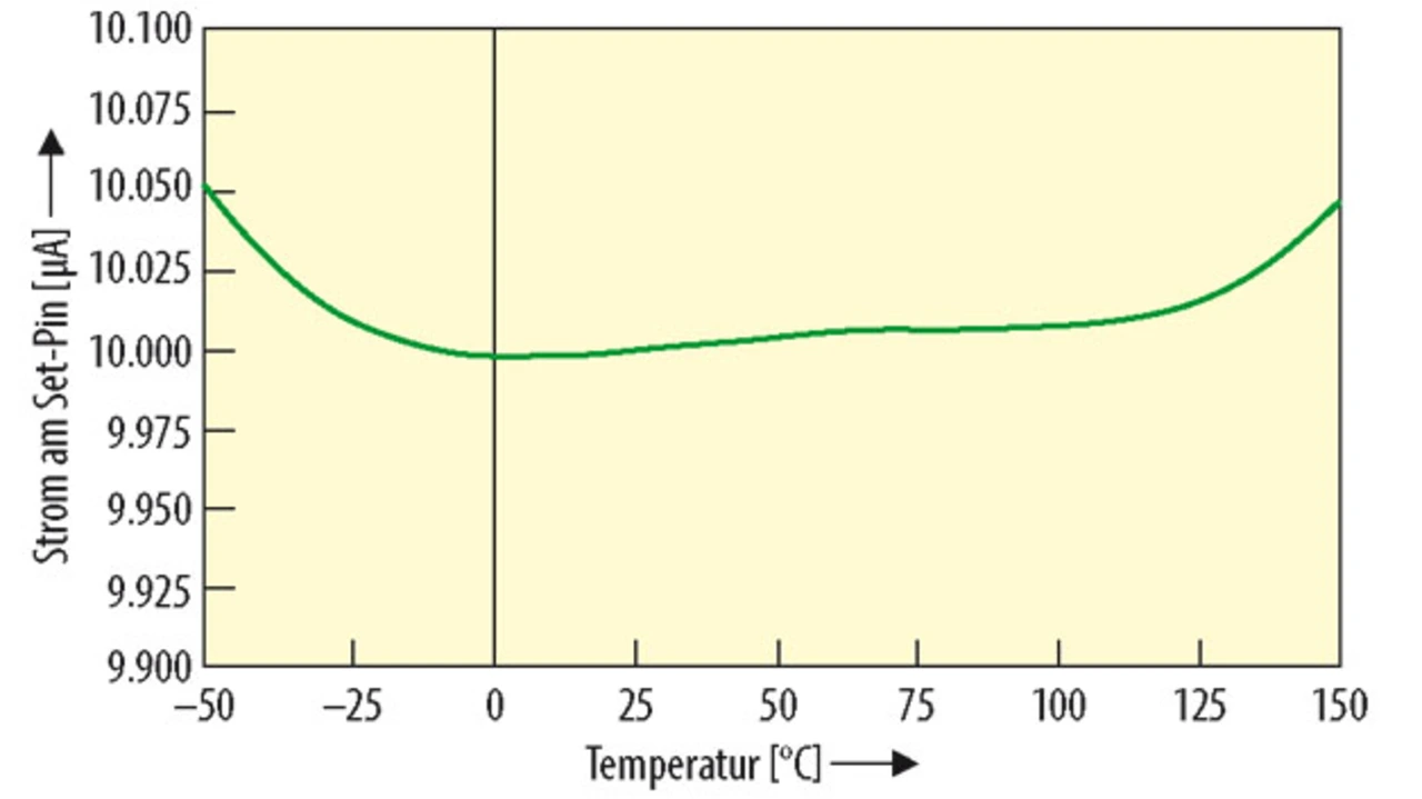 Der Quellenstrom ergibt sich dabei zu IQuelle = 10 µA · RSet/RAus). Die Differenz zwischen der Eingangsspannung Uein und der Ausgangsspannung U aus darf zwischen 1,2 und 40 V liegen.