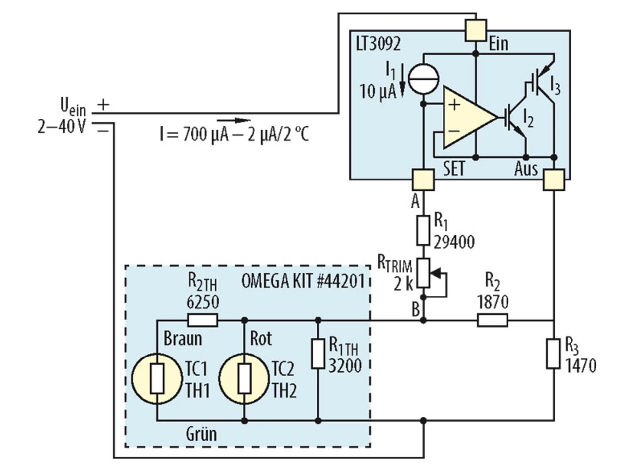 Bild 3 zeigt den Schaltplan des linearen Thermistorkit 44201 von Omega mit dem LT3092 und den zusätzlichen Widerständen. Die Bestimmung der Widerstandswerte entsprechend der jeweiligen Applikation vorgenommen werden. Dabei gelten: