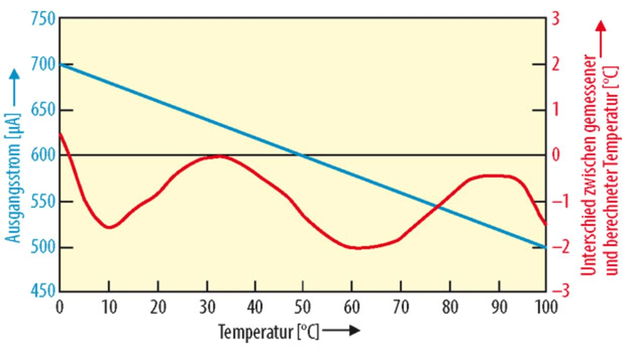 Jetzt kann mit einer Zweidrahtleitung die Temperatur auch über eine große Entfernung gemessen werden. Durch Anlegen einer Eingangsspannung über dem spezifizierten Pegel des LT3092 (<2 V für die gezeigte Schaltung und deren Widerstandskombination) und Erfassen des resultierenden Stroms (1-kΩ-Widerstand und digitales Voltmeter verwenden) kann man nun Temperaturen messen. Bild 4 zeigt den Ausgangsstrom der Schaltung über die Temperatur und die Differenz zwischen Messung und Kalkulation.