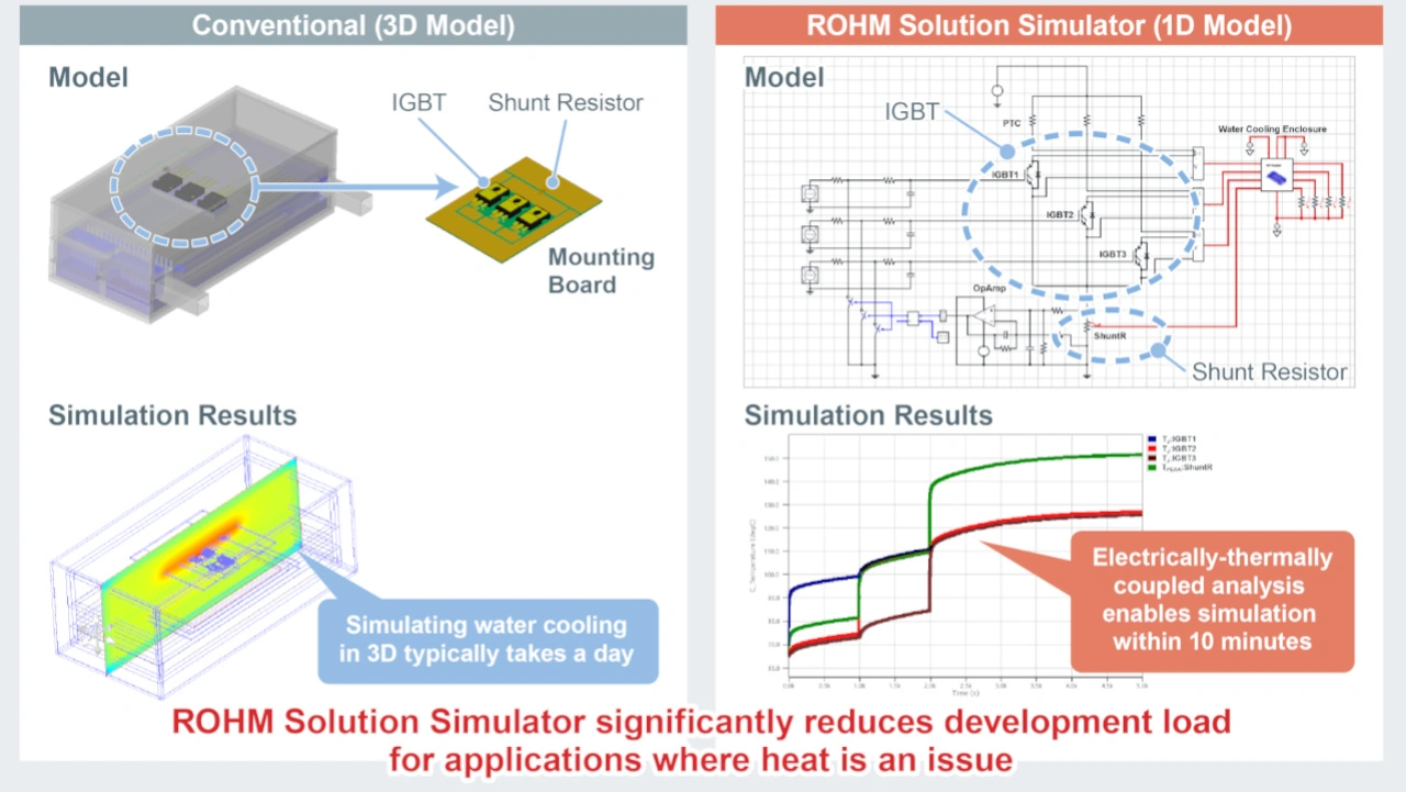 Dies ist laut Rohm der einzige Simulator in der Branche, der eine webbasierte, elektrisch und thermisch gekoppelte Analyse nicht nur der Sperrschicht-Temperatur des Halbleiters während des Betriebs ermöglicht, sondern auch der Pin-Temperaturen sowie der thermischen Beeinflussung von Bauteilen auf den Platinen der Lösungsschaltungen, die sowohl Leistungshalbleiter und ICs als auch passive Bauteile umfassen.