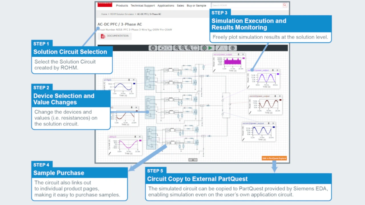 Der Solution Simulator von Rohm, der 2020 auf den Markt kam, ermöglicht eine Vielzahl an Simulationen: von der Bauteilauswahl über einzelne Bauteile bis hin zur Verifikation auf Systemebene. Damit sollen sich die Produkte des Unternehmens, wie SiC-MOSFETs, Gate-Treiber, Netzteil-ICs und passive Komponenten (z. B. Shunt-Widerstände), in Lösungsschaltungen unter realitätsnahen Anwendungsbedingungen verifizieren lassen.