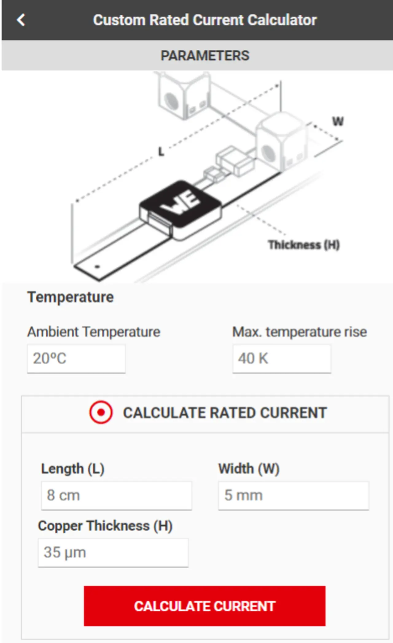Um den Nennstrom für Bauelemente zu bestimmen, wenn sie auf Leiterplatten unterschiedlicher Größe gemessen werden, hat Würth Elektronik seinen Nennstromrechner online über RedExpert [2] zur Verfügung gestellt, der es dem Benutzer ermöglicht, die gewünschten Leiterplattenabmessungen einzugeben (Bild 1).