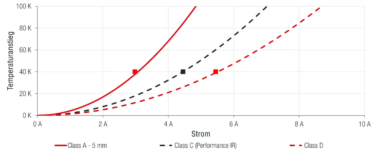 Betrachtet man die Induktivität WE-LHMI (744 373 460 68), so hat sie einen Nennstrom von 4,45 A (Bild 4). Dieser wird auf einer IEC 62024-2 IClass C Leiterplatte gemessen. Das Diagramm zeigt den Temperaturanstieg als Folge des Gleichstroms für dieses Bauteil auf der IC-Klasse A 5 mm, IC-Klasse C und IC-Klasse D Leiterplatte. Zusätzlich zeigt das Diagramm die Ausgabe des Nennstromrechners aus der RedExpert-Benutzeroberfläche, die online verfügbar ist, als Datenpunkte an. Wie man sehen kann, sind die berechneten Werte mit denen vergleichbar, die aus Bauteilmessungen gewonnen wurden.