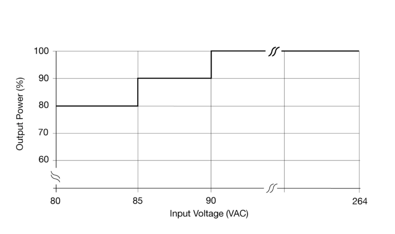 Produkte, die für den weltweiten Einsatz konzipiert sind, haben einen universellen Eingangsbereich, der in der Regel von 90 V bis 264 V reicht. Normalerweise wird von einem Produkt mit Universaleingang erwartet, dass es die volle Nennleistung über diesen Eingangsbereich bereitstellt. Allerdings liefern einige Produkte auch bei niedrigeren Eingangsspannungen bis hinunter zu 85 V oder 80 V eine geringere Ausgangsleistung, um den Betrieb in Regionen abzudecken, in denen die Netzspannung anfällig für Einbrüche ist (Bild 2).