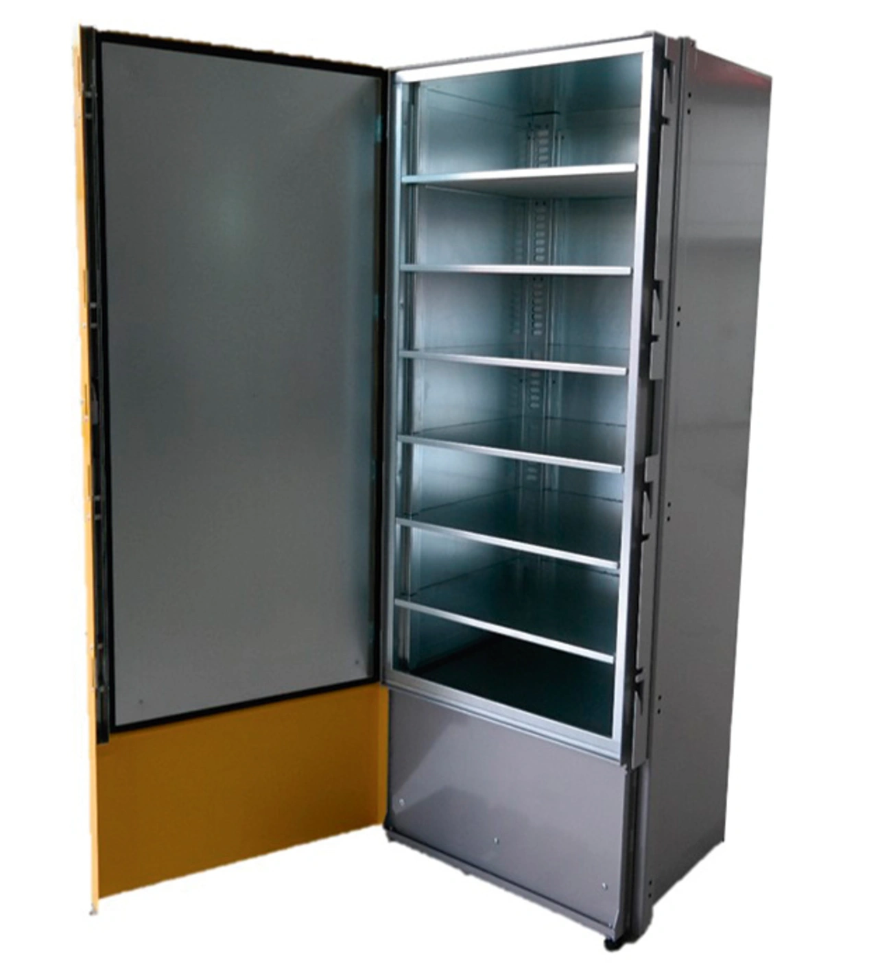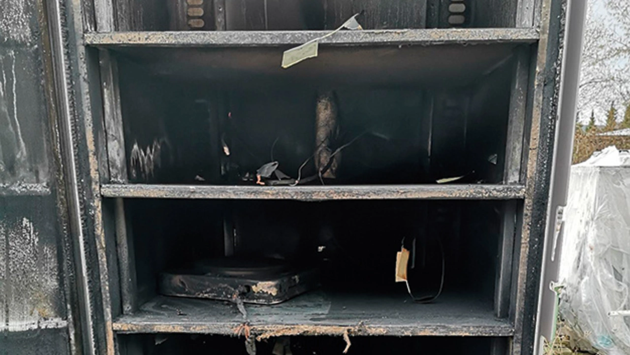 Ein integriertes Thermomanagement verhindert eine kritische Temperaturerhöhung der Außenwände. Bild 2a zeigt den »Strainlock« von Stöbich, der für eine Gesamt-Batteriekapazität von bis zu 10 kWh ausgelegt ist. In Bild 2b ist er nach einem absichtlich eingeleiteten Brand zu sehen: Der Versuch ist glimpflich ausgegangen; der Schrank ist nicht mehr verwendbar, aber das Feuer ist nicht auf die Umgebung übergegangen.
