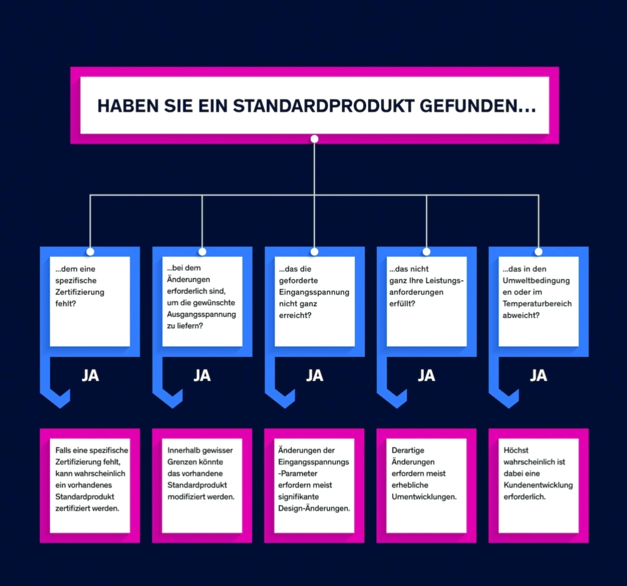 Eine kundenspezifische Stromversorgung bedeutet nicht automatisch ein neues, noch nie dagewesenes und teures Design. Denn es existieren bereits Lösungen für beinahe alle Anwendungsfälle. Aus diesem Grund ist die Entscheidung für ein bestehendes Standardprodukt mit geringfügigen Änderungen oder einer zusätzlichen Zertifizierung oftmals eine gute Alternative, um mit geringem Mehraufwand zur passenden Stromversorgung zu kommen.