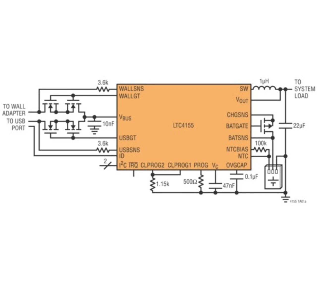 Eine einfache Zweidraht-I²C-Schnittstelle bietet Zugriff auf die Messwerte des NTC/ADC, was die Justierung des Ladestroms und der Spannungseinstellungen erlaubt. Die I²C-Schnittstelle ermöglicht durch die Steuerung von 16 Einstellungen der Eingangsstrombegrenzung (einschließlich USB-2.0- und -3.0-Einstellungen) auch die Kompatibilität zu USB. Der Kommunikationsbus erlaubt es dem LTC4155 zusätzlich, Zustandsinformationen anzuzeigen, wie den Zustand der Eingangsstromversorgung und des Ladebausteins sowie aufgetretene Fehler. Die Unterstützung von USB-On-the-Go ergibt ohne zusätzliche Komponenten eine 5-V-Versorgung zurück in den USB-Port.