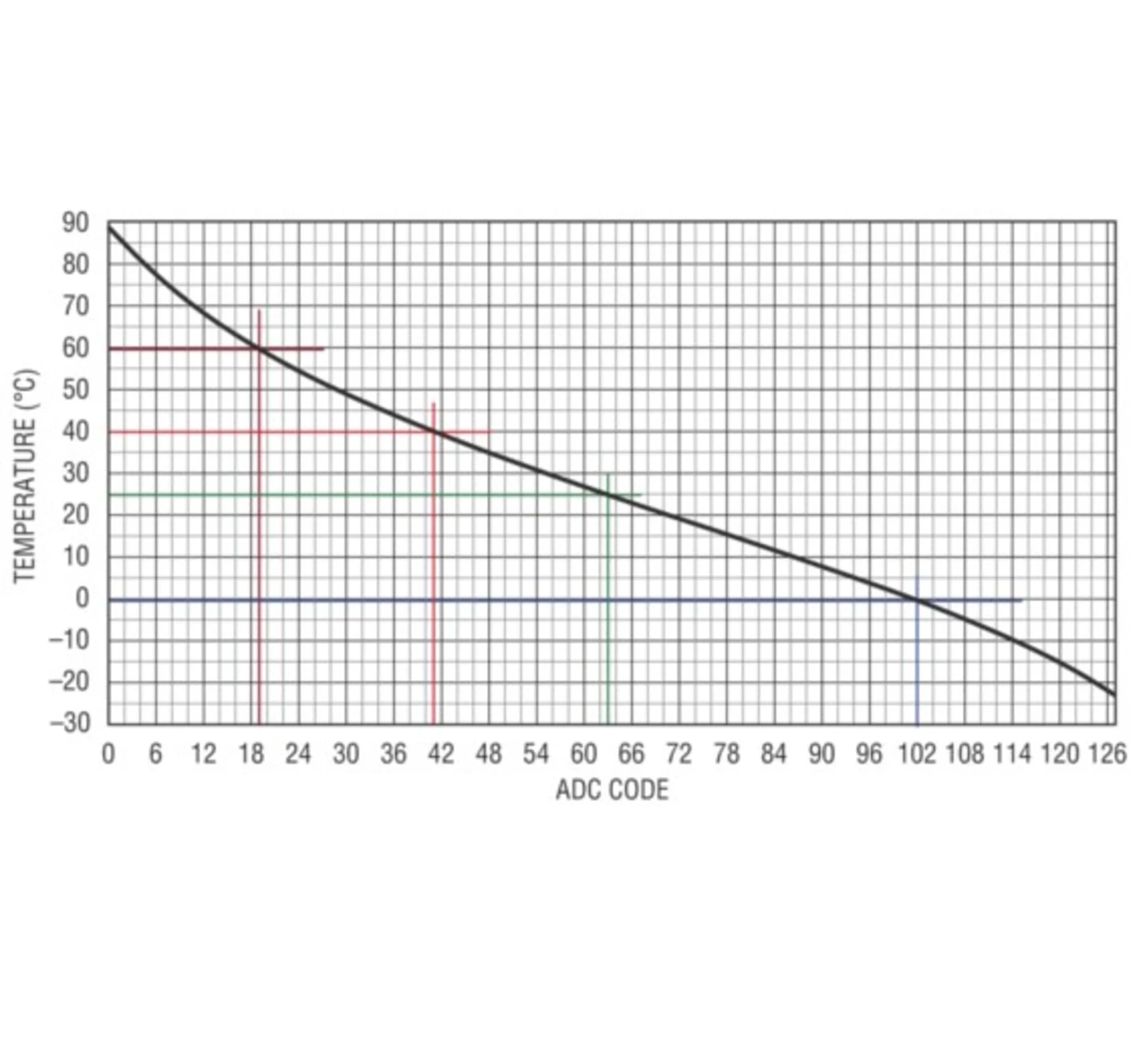 Beim Laden einer Batterie mit hoher Wiederholrate ist es besonders wichtig, die Sicherheit für die Batterie zu gewährleisten; sie ist daher zu überwachen. Der LTC4155 stoppt das Laden automatisch, wenn die Batterietemperatur unter 0 °C abfällt oder über 40 °C ansteigt (gemessen mit einem externen Thermistor mit negativen Temperaturkoeffizienten (NTC). Zusätzlich zu dieser autonomen Funktion hat der LTC4155 einen auf 7 Bit Auflösung erweiterten A/D-Wandler (ADC), um die Batterietemperatur mit rund 1 °C Genauigkeit zu überwachen, wie es in der Abbildung illustriert ist. Kombiniert mit den vier Schwebespannungen und 15 Einstellungen des Batterieladestroms, kann dieser ADC dazu genutzt werden, abhängig von der Batterietemperatur kundenspezifische Ladealgorithmen zu generieren.