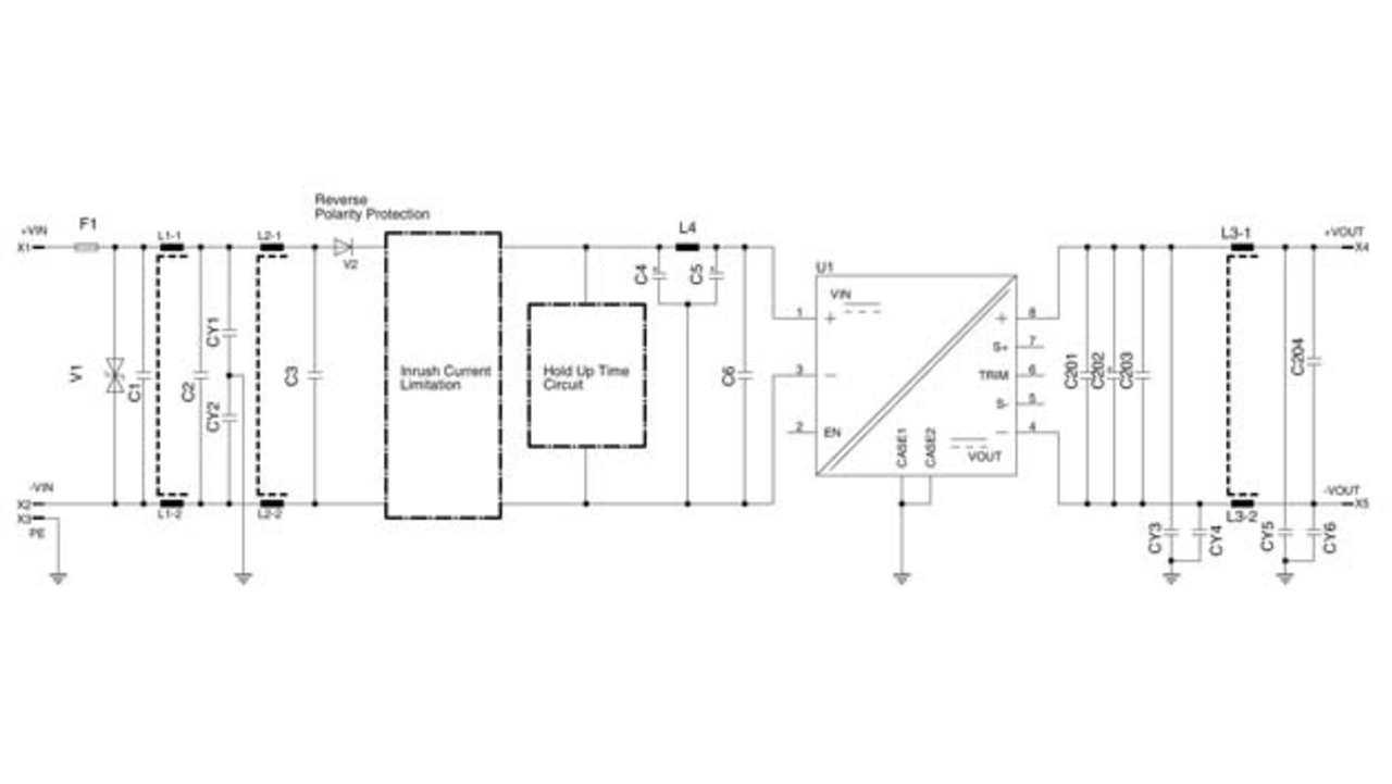 Die zu entwickelnde Schaltung muss den Wandler oder die Applikation gegen Surge und Burst schützen, die Störaussendungen über die Leitungen und das Gehäuse reduzieren und bei Bedarf eine Netzausfallüberbrückung von mindestens 10 ms bieten (Klasse S2). Die korrekte Anbindung zur Kühlung kann über einen Kühlkörper erfolgen oder direkt über das Gehäuse der Anwendung.