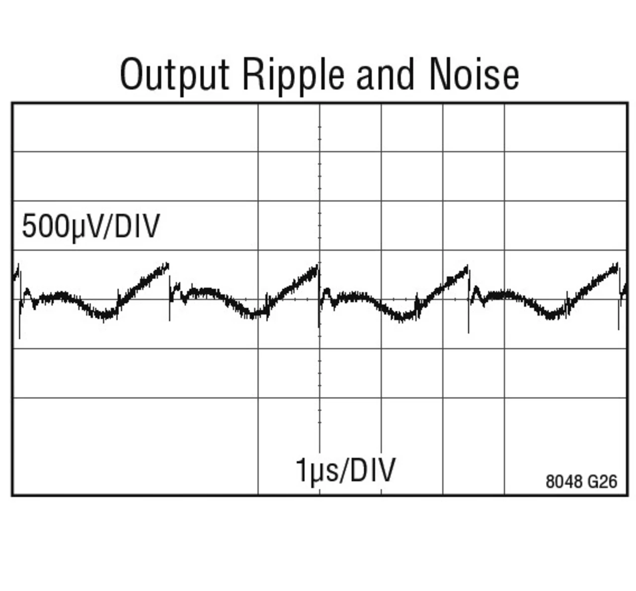 Der integrierte Linearregler mit geringem Ausgangs-Ripple auf der Sekundärseite erzeugt eine Spannung mit geringer Welligkeit, um hochgenaue A/D-Wandler oder Verstärker mit geringem Offset zu versorgen. Wird noch zusätzlich ein optionaler Referenz-Bypass-Kondensator von 0,01 µF genutzt, sinkt der Ausgangsspannungs-Ripple auf weniger als 1 mVp-p und 20 µVRMS im Bereich von 10 Hz bis 100 kHz ab (Bild 2). Mit dem Referenz-Bypass-Kondensator verbessert sich aber auch das Transientenverhalten des Reglers. Die Genauigkeit der Ausgangsspannung über den gesamten Temperaturbereich beträgt ±2,5 Prozent. Der Linearregler ist gegen Verpolung am Eingang und gegen Rückströme am Ausgang geschützt.