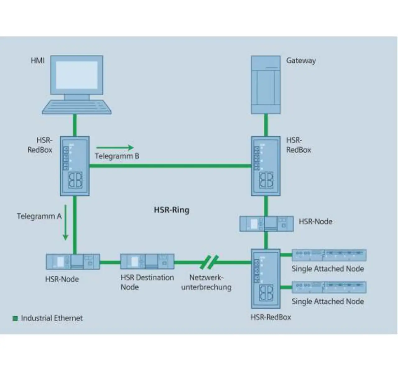 Auch das HSR-Verfahren ist im internationalen Standard IEC 62439-3 definiert. Basis ist jedoch ein einziger physikalischer Ring. Auch hier werden Telegramme der Endgeräte gedoppelt und in zwei Richtungen des Rings gesendet. Bei einer Unterbrechung auf einem der Wege kommt das zweite Telegramm ohne Unterbrechung über den zweiten Weg an. Die Verdoppelung der Telegramme wird von den angeschlossenen HSR-fähigen Endgeräten (HSR-Nodes) oder durch Vorschaltgeräte (HSR-Redundancy-Boxes, kurz RedBoxes) realisiert. Mit der HSR-RedBox lassen sich somit Endgeräte anbinden, die nicht HSR-fähig sind (Abbildung 3).