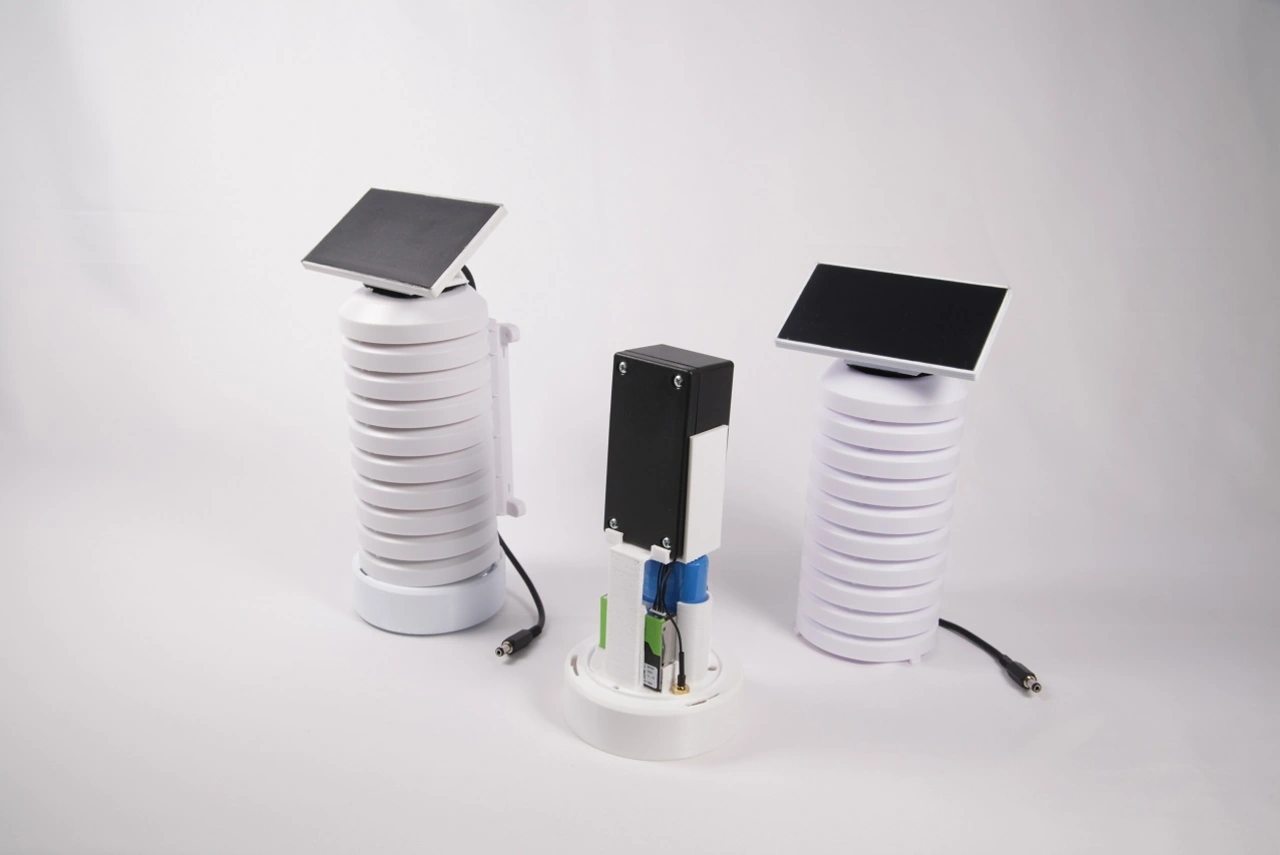 Sensoren und Elektronik sind in einer für Mikroklima-Sensorik üblichen Wetterhütte untergebracht (Bild 1). Eine eigens entworfene 3D-gedruckte Innenkonstruktion fixiert die Komponenten dabei. Der Sensorknoten eignet sich für die Montage an Masten, das Solarpanel für die Energieversorgung wird darüber installiert.