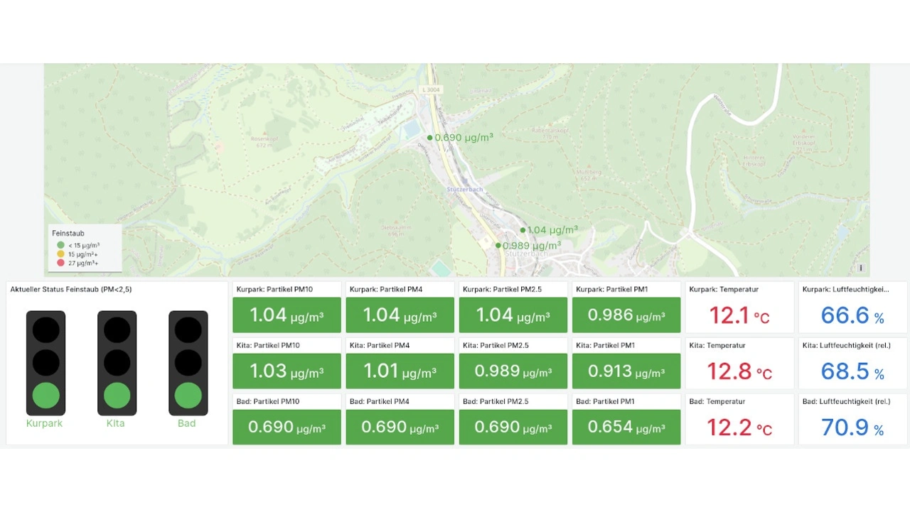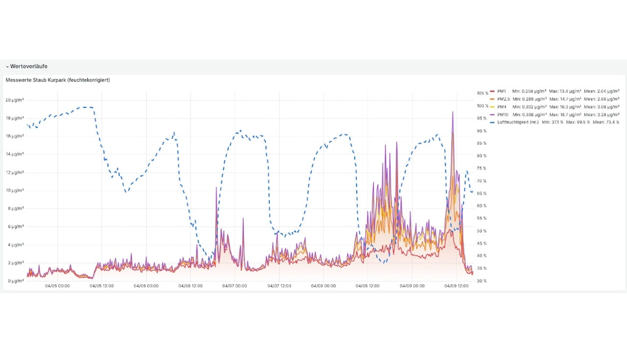 Neben der Erfassung der unterschiedlichen Partikelgrößen und Mikroklimaparameter erfolgt eine autonome Feuchtekorrektur der Feinstaubmesswerte. Diese werden mit Dashboards visualisiert, wobei unterschiedliche Darstellungen von Zeitreihen bis hin zu Grenzwert-Ampeln sowie Anpassungen an spezifische Bedürfnisse eines Anwendungsfalls möglich sind. Über das Kurklima-Monitoring hinaus eignet sich die Lösung auch zum Monitoring von Feinstaub im Allgemeinen, beispielsweise im städtischen Raum.