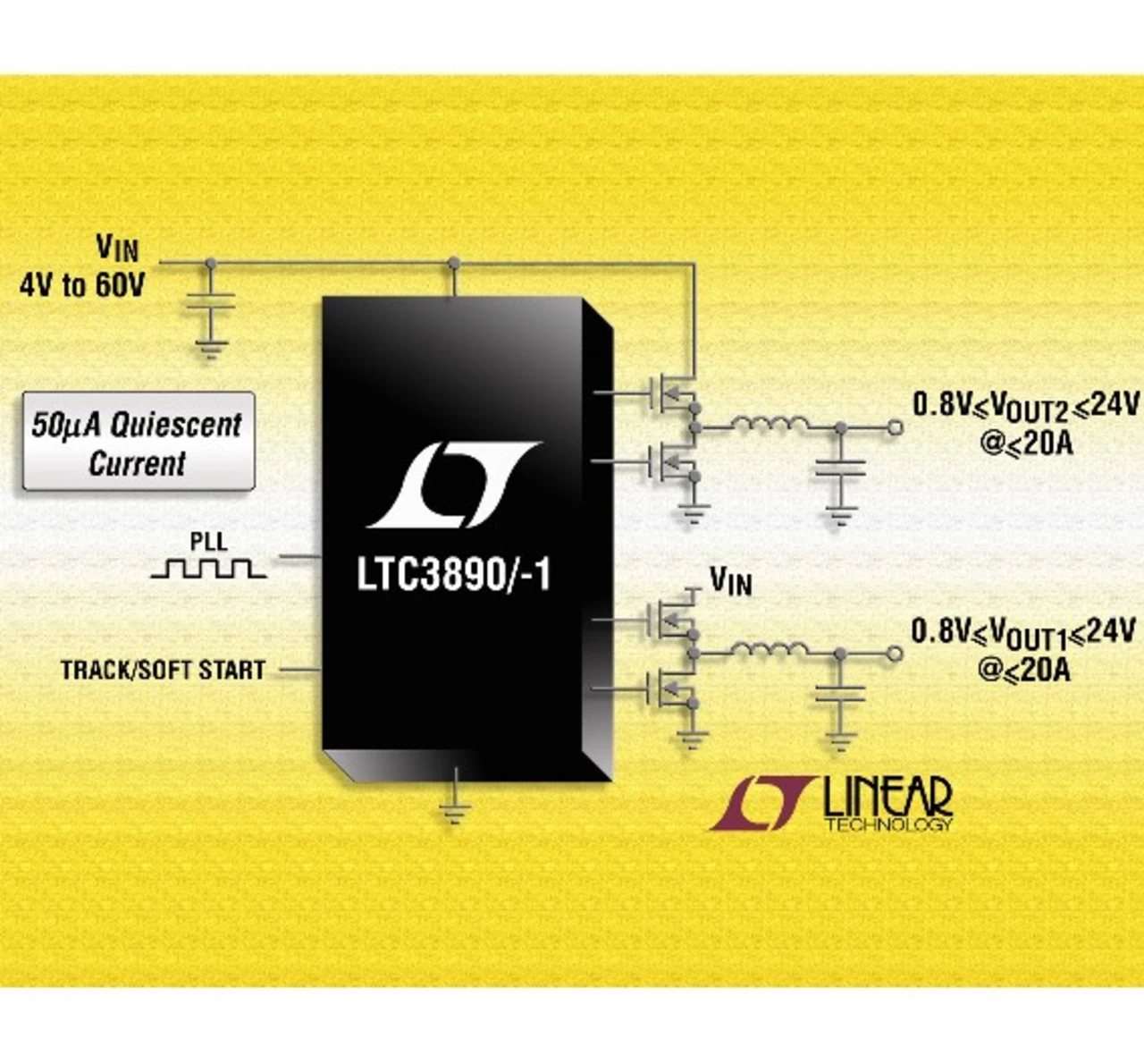 Tony Armstrong, Director of Product Marketing Power Products beim US-amerikanischen Halbleiterhersteller Linear Technology meint dazu: »Linears LTC3890 ist oft eine gute Wahl, denn dieser duale Schaltregler hat bei zwei aktiven unbelasteten Kanälen einen Ruhestrom von 60 μA. Ist einer der Kanäle abgeschaltet, sinkt der Leerverbrauch auf 50 μA, und wenn beide abgeschaltet sind, fließen nur noch 14 μA. Zudem bietet der Baustein mit 4 bis 60 V einen relativ großen Eingangsspannungsbereich, eine gute Stromdichte und eine zulässige Grenzschichttemperatur bis 150 °C. Und weil er Schaltfrequenzen von mehr als 2 MHz zulässt, beansprucht die Gesamtlösung nur wenig Platz.«