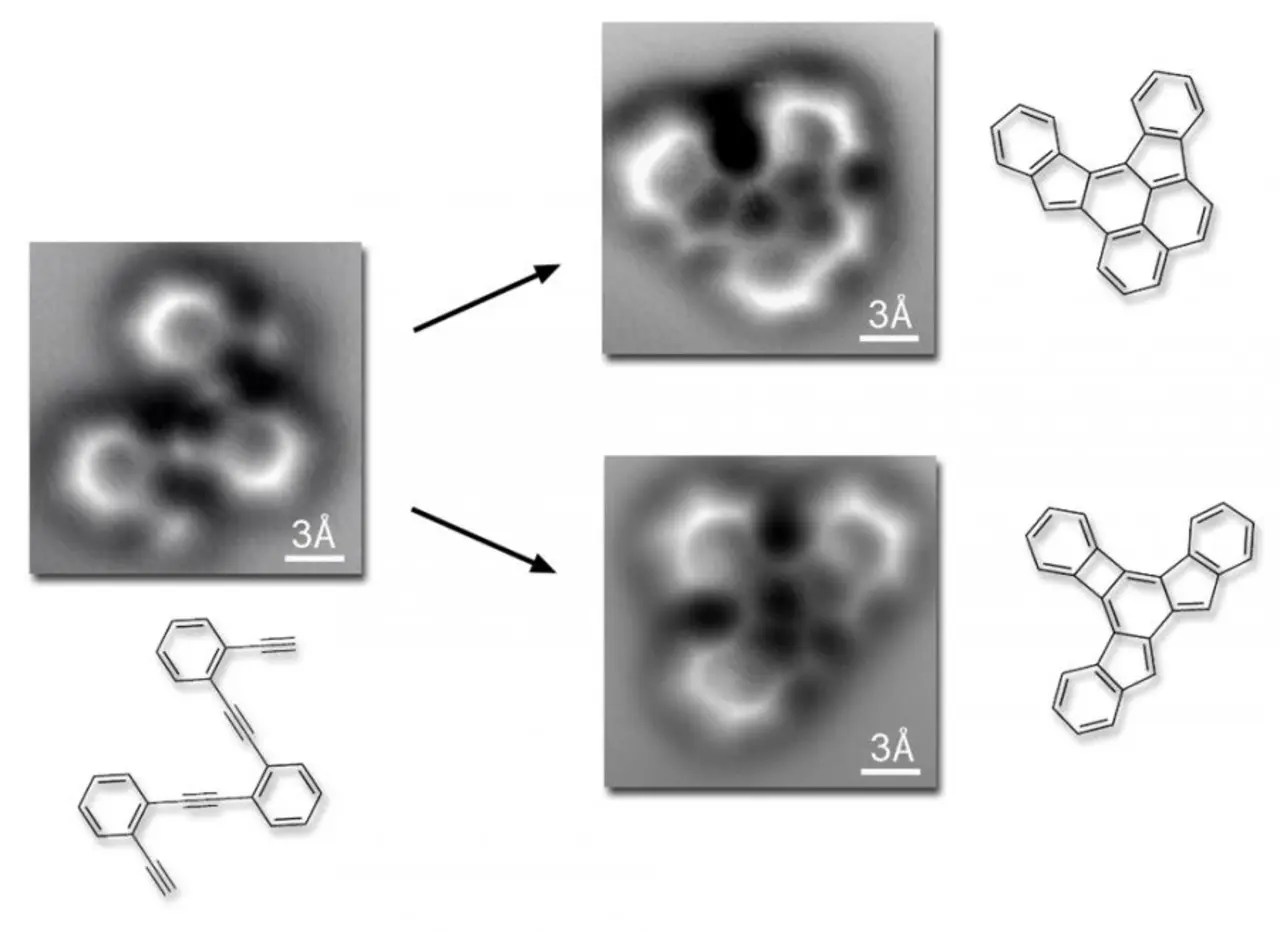 Erstmals ist es Forschern gelungen, die mit chemischen Reaktionen einhergehenden atomaren Veränderungen fotografisch zu dokumentieren. Dazu wurden Aufnahmen eines Rasterkraftmikroskopes mit einer Auflösung von ca. einem Angström (zehn Milliardstel Millimeter) miteinander verglichen.