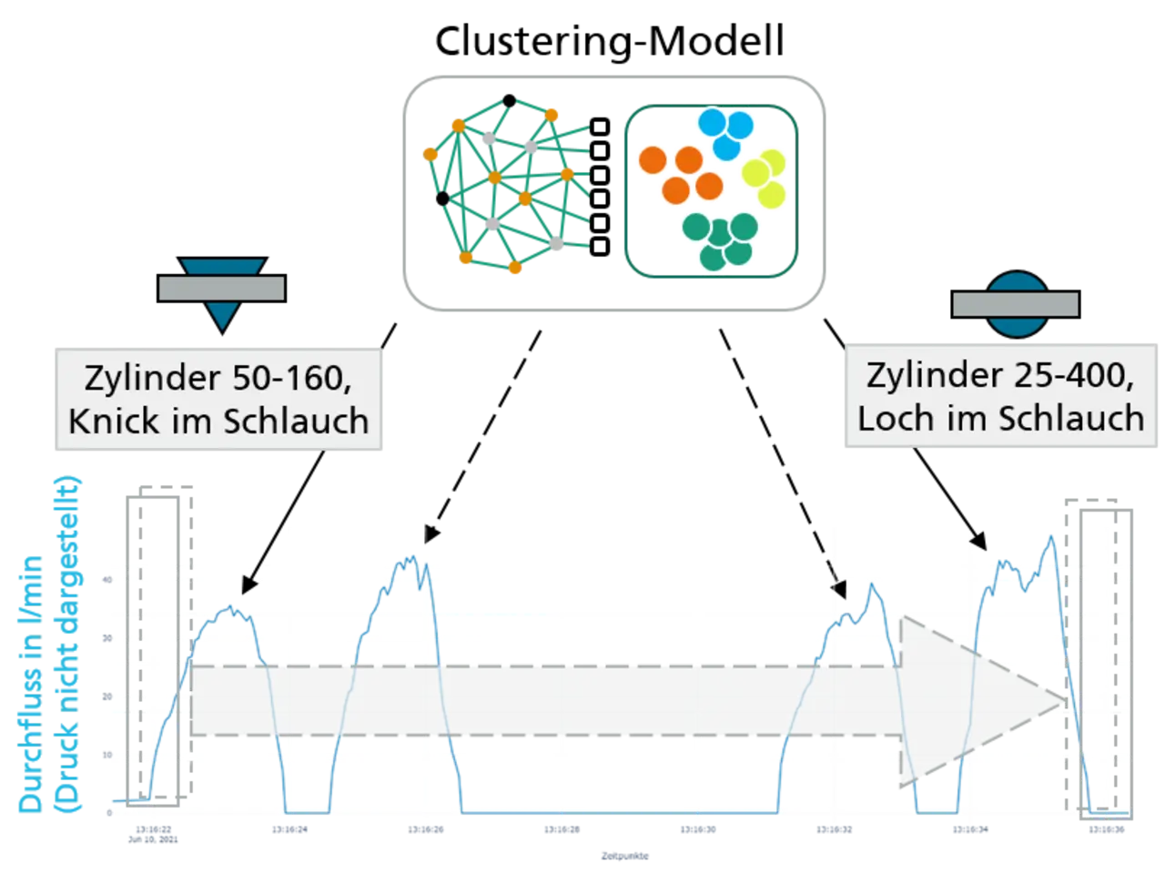 Doch künftig wird es keinen Grund mehr geben, Druckluft unnötig entweichen zu lassen und auf die Energieeinsparpotenziale zu verzichten. Denn Forscher Dierolf entwickelt in enger Zusammenarbeit mit der Sick einen Leckage-Zusatzservice für deren intelligenten Durchflusssensor. Er zeichnet laufend Druck, Temperatur und Durchflussrate auf und generiert daraus lückenlose Kurvenverläufe. Auswerten soll diese Kurven ein selbstlernender Algorithmus. »Der Clou ist dabei das sogenannte Clustering: Leckagen schlagen sich in charakteristischen Kurvenverläufen nieder. Diese erkennt der Algorithmus und schlägt Alarm«, erklärt Dierolf.