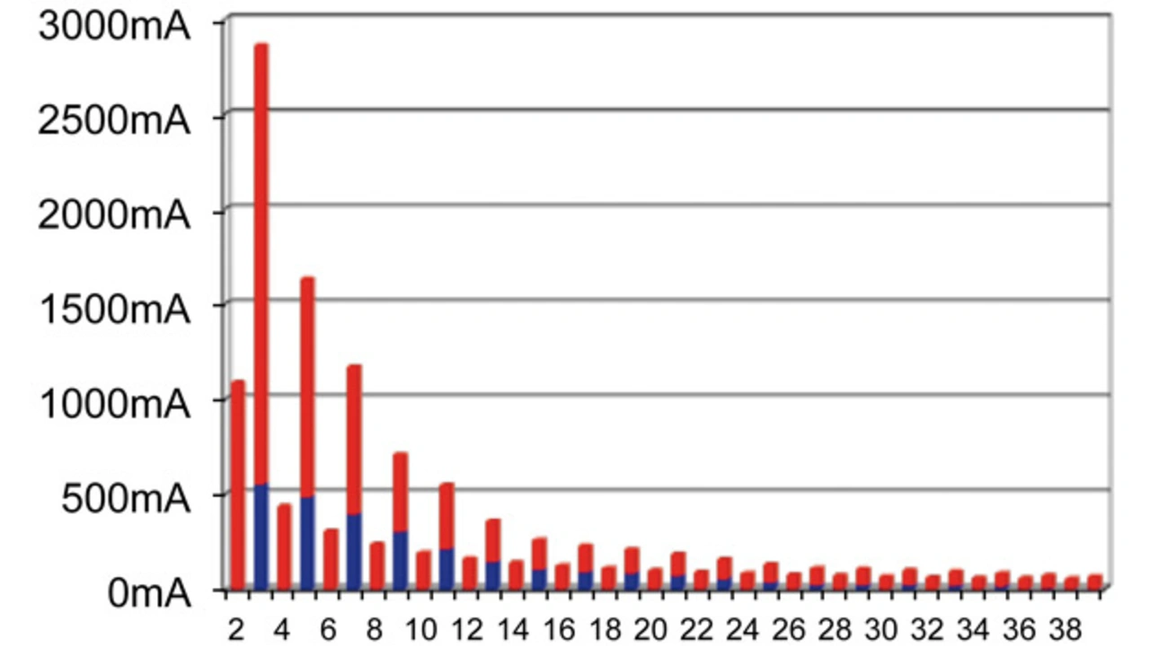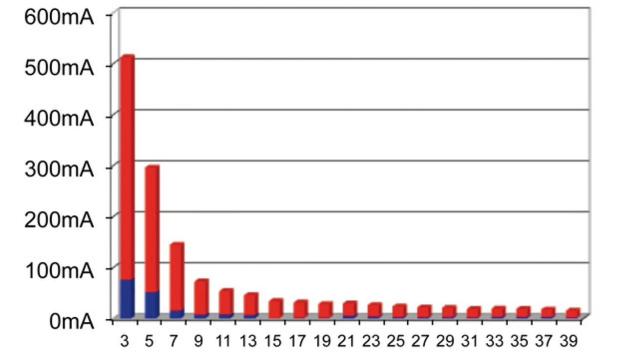 Bei identischer Leistung ist zu erkennen, dass ein Netzteil mit einer PFC der Klasse A einen geringeren Stromflusswinkel mit höherem Spitzenstrom aufweist als ein vergleichbares Netzteil mit aktiver PFC, welches den Strom linear zur Spannung entnimmt. Bei den Bild 6 und Bild 7 ergibt die Betrachtung der harmonischen Oberwellen gemäß IEC 61000-3-2 die Ergebnisse in Bild 8 und Bild 9.