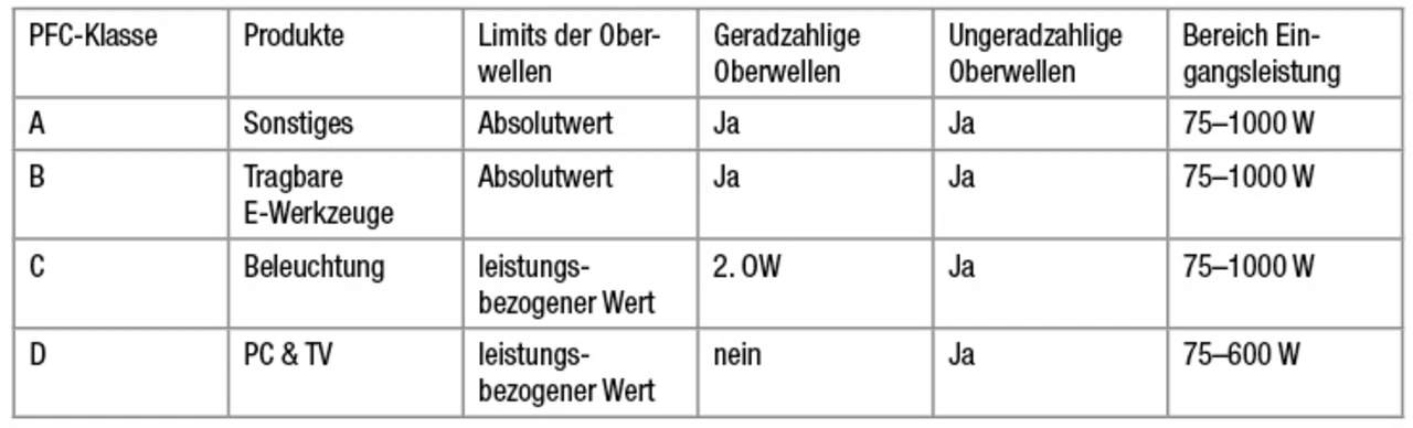 Gemäß der Norm werden bis zu 40 Oberwellen gemessen. Je nach Art des Endprodukts sind unterschiedliche Limits definiert (Klasse A bis D, s. Tabelle 1), die entweder einen Absolutwert des Stroms für jede Oberwelle vorgeben oder sich prozentual auf die reale Ist-Eingangsleistung beziehen. Entsprechend der jeweiligen Eingruppierung in eine Klasse werden entweder alle Oberwellen berücksichtigt (A und B) oder nur ungeradzahlige Oberwellen (C und D). Geprüft werden müssen Produkte mit einer Betriebsspannung von 230 V AC, einem Strom von maximal 16 A und mit Anschluss an das öffentliche Versorgungsnetz.