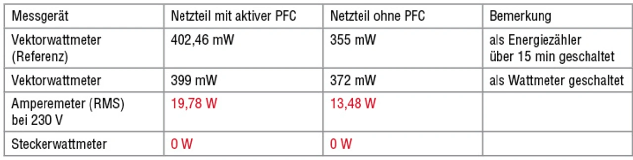 Anders stellt sich die Situation bei der Messung der Leerlaufleistung dar. Bei Werten von <0,5 W ist eine kontinuierliche Entnahme nicht wahrscheinlich. Dies führt zu den Ergebnissen in Tabelle 3. Einfache Messgeräte liefern hier ein völlig falsches Ergebnis. Daraus folgt: Bei der Messung der Eingangsleistung muss die Kurvenform bzw. das Vorhandensein einer PFC-Stufe berücksichtigt werden!