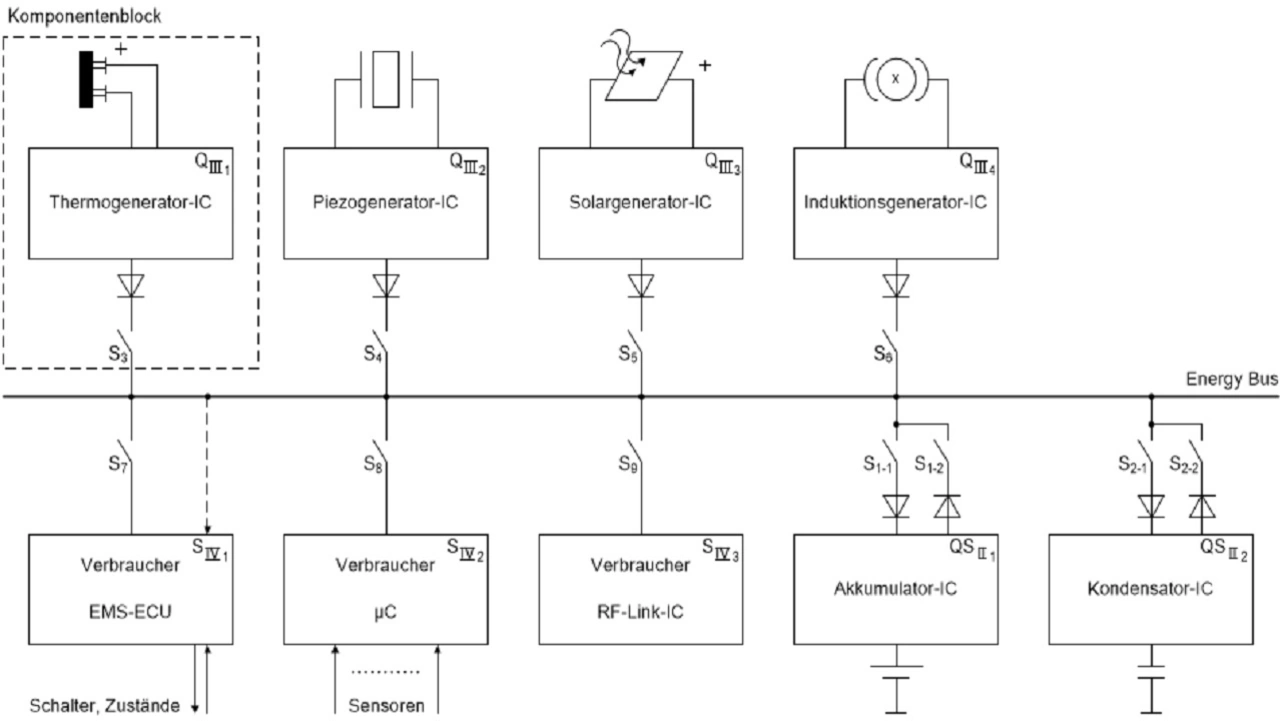 Alle Energiekomponenten sind energetisch über einen Energy Bus (EB) mit seiner Spannung UEB miteinander verbunden und informationstechnisch mit der EMS-ECU (Master) verknüpft. Der jeweilige Komponentenblock enthält einen IC (Spannungsaufbereitung, Diagnose). Die EMS-ECU bewertet die Spannung UEB, erhält von den Komponenten Aussagen über ihre Verfügbarkeit sowie über den Speicherzustand und übernimmt das Energiemanagement, wobei die Systemschalter (S, optional im IC) gesteuert werden.
