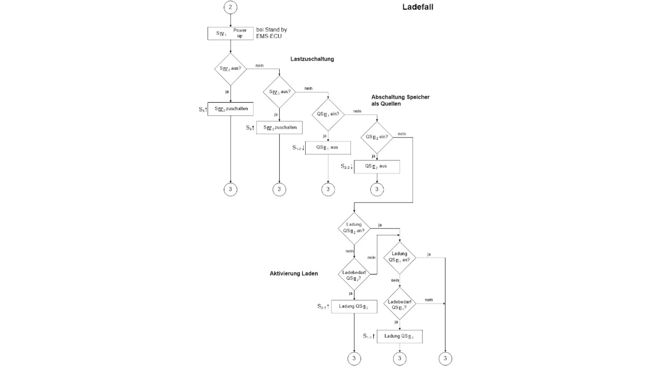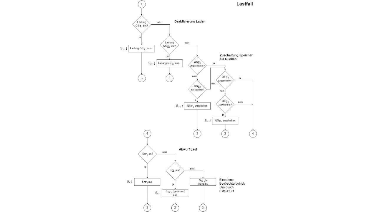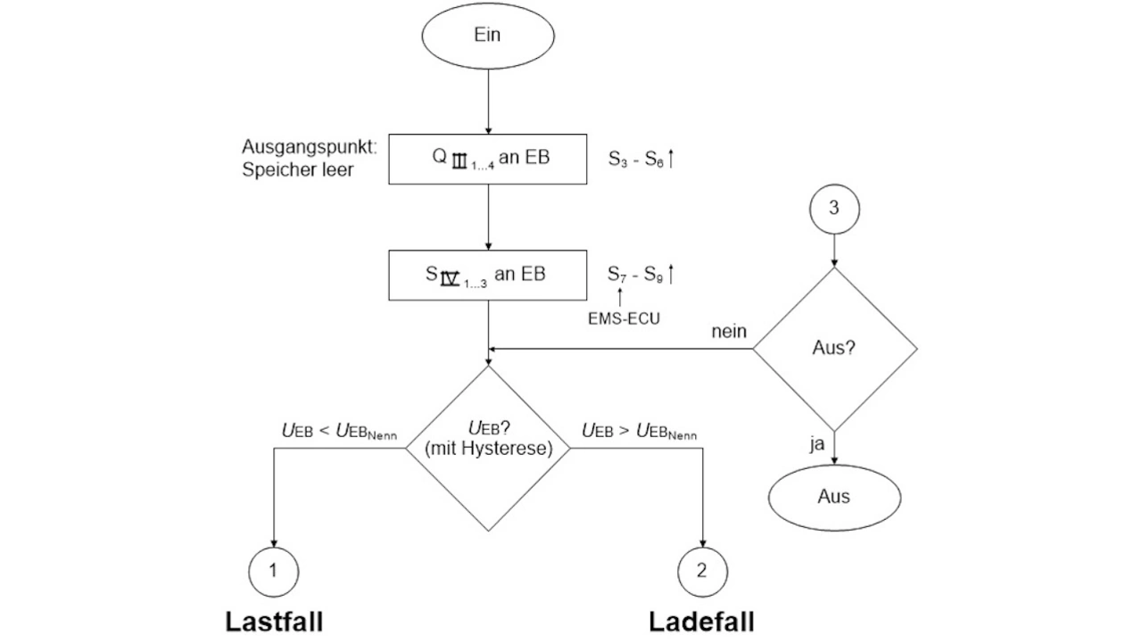 Der Algorithmus für das Energiemanagement besteht aus drei Teilen. Teil 1 (Bild 3) bewertet auf der Grundlage der UEBNenn hysteresebehaftet die Spannung UEB und entscheidet, ob es sich um einen Last- oder Ladefall handelt.