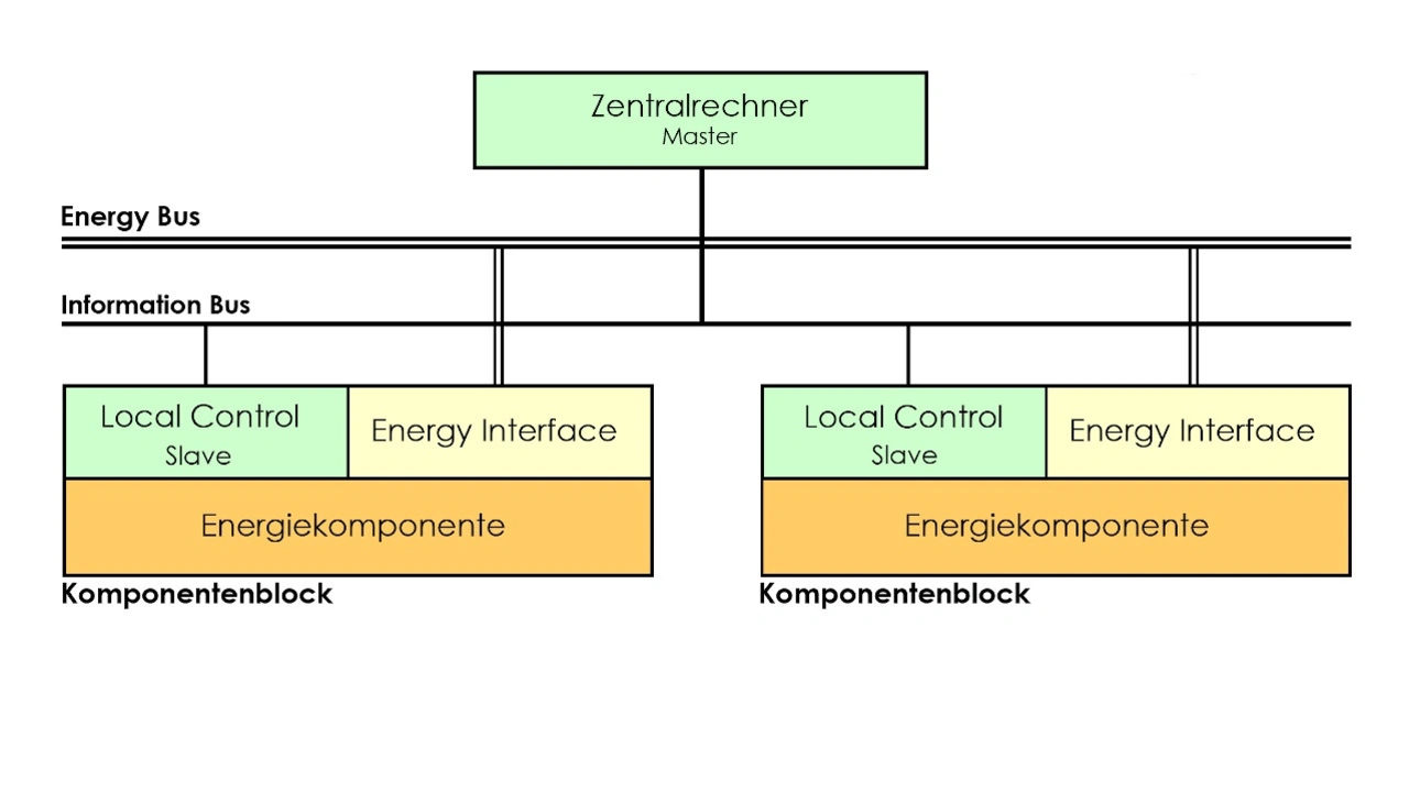 Bild 1 verdeutlicht die Struktur des Energiemanagementsystems. Die einzelnen Energiekomponenten werden zusammen mit ihrer Local Control (Slave) und ihrem Energy Interface (energetische Anpassung) zu Komponentenblöcken zusammengefasst, die ihren Betrieb eigenständig realisieren, sich selbst diagnostizieren und dem Energiemanagement Zustandsdaten zur Verfügung stellen. Alle Komponentenblöcke sind über den Energy Bus miteinander verbunden und informationstechnisch mittels Information Bus an einen Zentralrechner (Master) angeschlossen. Die Energiemanagementsoftware ist über Zentralrechner und Komponentenblöcke verteilt.