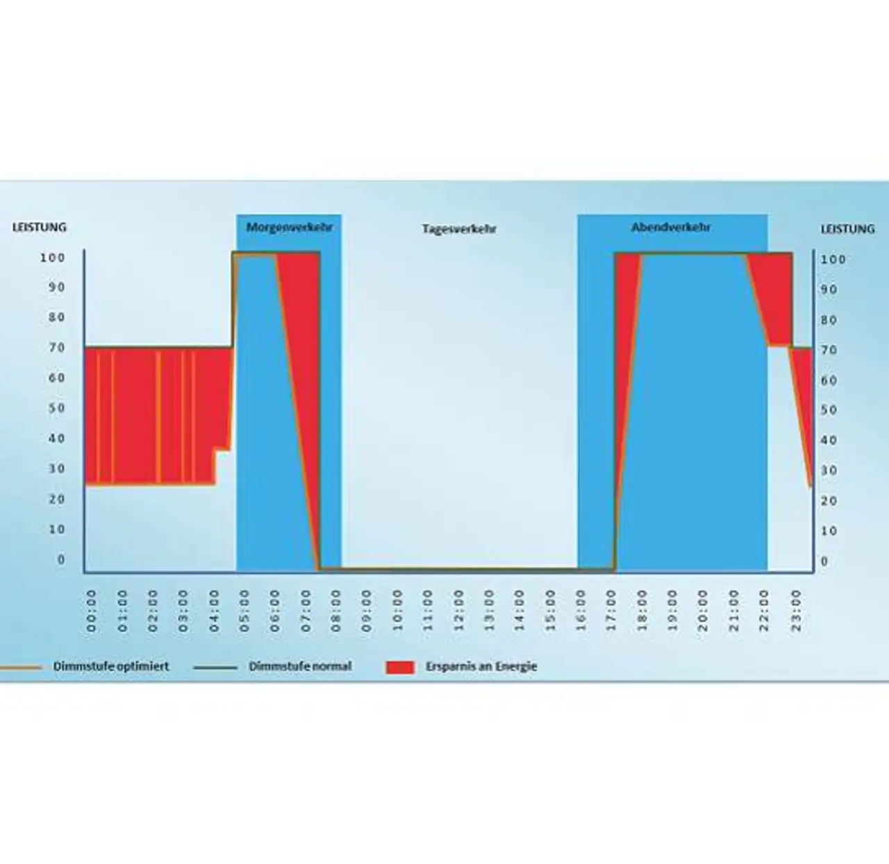 Um jeden Lichtpunkt individuell einstellen zu können, ist ein Analyse-Algorithmus erforderlich, ein genauer Handlungsplan, der gemäß den aktuellen Daten die jeweils passenden Schritte auswählt und sie an eine zentrale Kontrolleinheit weitergibt. »Wenn zum Beispiel eine Leuchte, die an einen Bewegungsmelder gekoppelt ist, ständig wieder hochgefahren wird, soll der Algorithmus das erkennen und die Steuerung veranlassen, die Leuchte dauerhaft einzuschalten, weil das effektiver ist«, so Mühlberger. »Erst wenn der Bewegungssensor vermehrt unregelmäßige Aktivität meldet, wird der Lichtpunkt wieder auf dessen Signale umgestellt.« So ließen sich etwa zwischen 22 und 5 Uhr, wenn kaum Verkehr herrscht, die Laternen auf ein niedriges Niveau dimmen und nur auf höhere Leistungen schalten, wenn ein Passant oder Fahrzeug kommt. Die Sicherheit bliebe gewahrt, ohne unnötig Strom zu verschwenden. Auch ein stufenweises Ein- und Ausblenden in den Abend- und Morgenstunden ist möglich, statt wie bisher direkt umzuschalten und das vorhandene Tageslicht nicht zu nutzen.