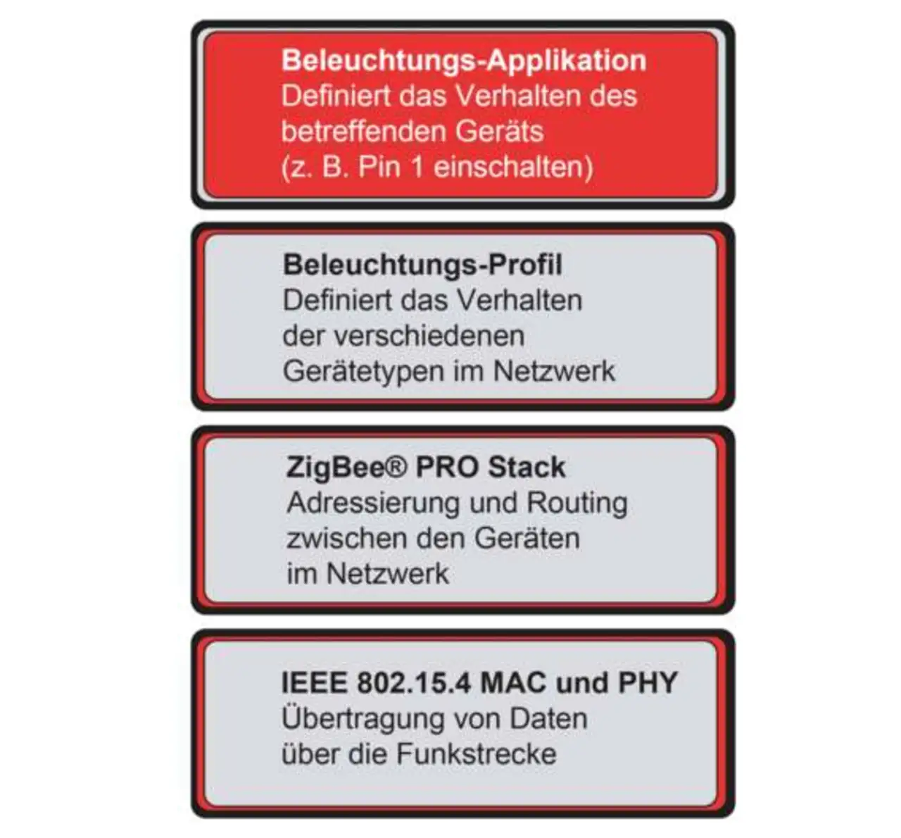 Diese Profile  stellen sicher, dass standardmäßige Geräte definiert sind, die mit  standardmäßigen Telegrammen Befehle wie zum Beispiel »ein« oder »aus«  (im Falle von Schaltern) senden. Auch für Aspekte wie die Inbetriebnahme  und die Sicherheit halten diese Profile Lösungen bereit. Auf diese  Weise ist gewährleistet, dass beispielsweise Leuchten von einem Anbieter  mit den Schaltern eines anderen Anbieters interoperabel sind.