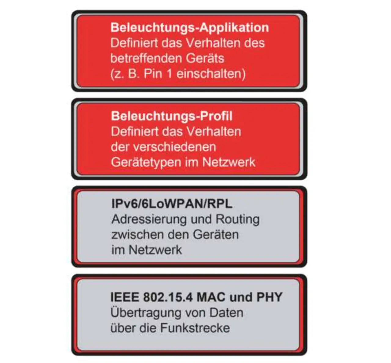 Die   Herausforderung, die sich beim Einsatz der 6LoWPAN-Technik in   Beleuchtungssteuerungs-Lösungen heute stellt, hat damit zu tun, dass bis   dato noch keine Anwendungsschichten definiert wurden. Obwohl also die   Netzwerktechnik selbst umfassend definiert ist und auf offenen  Standards  basiert, steht die Entwicklung standardbasierter Lösungen für  Aspekte  wie die Kommissionierung und die Sicherheit noch aus. Weil  aber zurzeit  keine Spezifikation für die Anwendungsschicht existiert  und es auch  keine Zertifizierungs-Lösungen eines  Standardisierungs-Gremiums gibt,  fehlt es momentan an einem  vorgezeichneten Weg zur Herstellung von  Produkten, die mit den  Erzeugnissen anderer Hersteller interoperabel  sind.