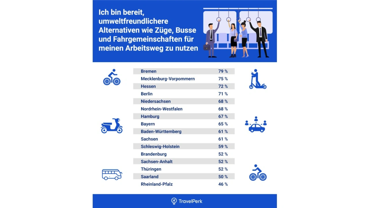 Während sich diese Angaben bei Frauen und Männern kaum unterschieden, zeigten sich regional jedoch erstaunliche Unterschiede: Bremens Bürger erwiesen sich in der Studie als Deutschlands Öko-Spitzenreiter. Dort sind 79 Prozent bereit, grünere Transportalternativen zu nutzen. Darauf folgen Mecklenburg-Vorpommern (75 Prozent) und Hessen (72 Prozent). Berlin landete mit 71 Prozent auf Platz 4. Am unteren Ende der Liste reihen sich die Bewohner von Rheinland Pfalz ein, hier sind nur 46 Prozent bereit, ihren Arbeitsweg umweltfreundlicher zu gestalten.