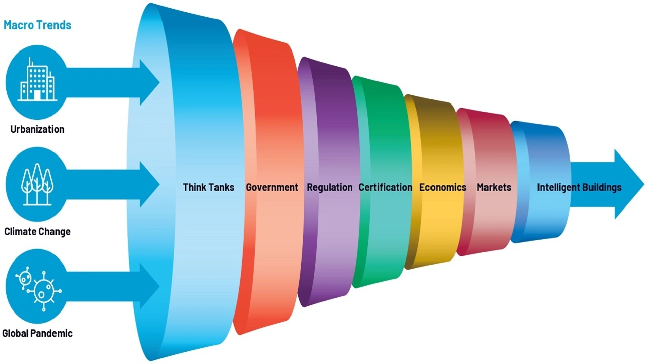 Intelligente Gebäudemanagementsysteme liefern die nötigen Daten, um Entscheidungen bezüglich Nachhaltigkeit und Effizienz, Kommunikation, Gebäudesteuerung und Automatisierung, Gesundheit der Arbeiter und der Sicherheit zu treffen. Dies verbessert die Gesundheit und Sicherheit der Bewohner, optimiert die Nachhaltigkeit und Belastbarkeit und erhöht die Wirtschaftlichkeit des Immobilienmarktes.
