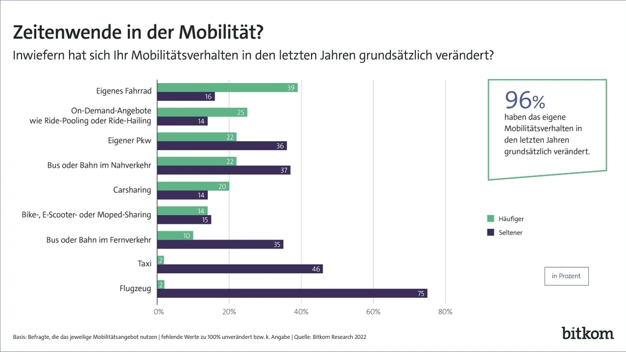 96 Prozent der Befragten gaben an, in den letzten Jahren ihr Mobilitätsverhalten grundlegend verändert zu haben – aus sehr unterschiedlichen Gründen. Rund die Hälfte (55 Prozent) nennt die Klimakrise als Grund, jeweils 4 von 10 (41 Prozent) das 9-Euro-Ticket sowie den gestiegenen Benzinpreis und 30 Prozent die Angst vor einer Ansteckung mit dem Corona-Virus. 17 Prozent haben ihr Mobilitätsverhalten aufgrund des Chaos an den Flughäfen verändert, 16 Prozent wegen der häufigeren Arbeit im Homeoffice, 13 Prozent aufgrund der Unzuverlässigkeit im Bahnverkehr und 7 Prozent wegen des Wegfalls von Dienstreisen. Klima, Corona und Kosten – aus diesen drei Gründen veränderten die Menschen ihr Mobilitätsverhalten, so Rohleder.