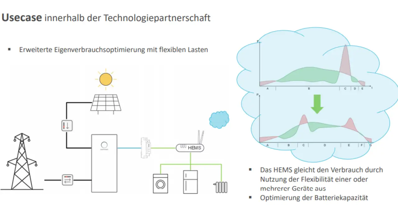 Damit können verschiedene Anwendungsfälle abgedeckt werden, beispielsweise die erweiterte Eigenverbrauchsoptimierung mit flexiblen Lasten. Weil die sonnenBatterie bereits über einen eigenen intelligenten Energiemanager verfügt, ist die prognosebasierte Eigenverbrauchsoptimierung schon lange unser Kerngeschäft: „das können wir«, sagt Bastian Hackenberg.