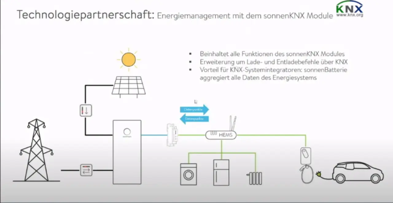 Im Rahmen der Technologiepartnerschaft hat sonnen in einem Proof of Concept das sonnenKNX-Modul um Energiemanagement-Funktionen erweitert, so dass auch Lade- und Entladebefehle über KNX gesteuert werden können. Auf diese Weise kann das Home Energy Managementsystem (HEMS) auch die sonnenBatterie individuell ansteuern. Dieses Projekt befindet sich aktuell im Prototypen-Stadium und ist daher noch kein fertiges Produkt.