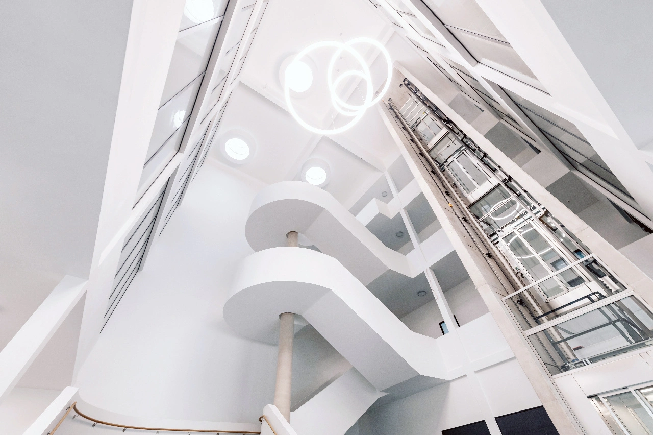 Das Herzstück der Vernetzung bildet das großzügige Foyer, in dem eine repräsentative Freitreppe alle Etagen miteinander verbindet. Die besondere Gestaltung bricht hier bewusst mit der klaren Geometrie der Gebäudestruktur und unterstreicht so die Besonderheit dieses Ortes. Die gesamte Fläche ist so gestaltet, dass die Interaktion zwischen den einzelnen Ebenen unterstützt wird. Im Erdgeschoss weitet sich die Treppe, und die breiten Sitzstufen laden zum Verweilen ein. Als Treffpunkt eignet sich das Foyer mit zusätzlichen Sitzmöglichkeiten und Sitzgruppen auch für Vorträge und Veranstaltungen. Der flexibel nutzbare Konferenzraum im Erdgeschoss, die Mitarbeiterlounge sowie die Besprechungs- und Pausenzonen auf jeder Etage schaffen zudem multifunktionale Räume zum informellen und formellen Austausch. Diese Kommunikationsräume bilden die Schnittstelle zwischen den Labor-, Büro- und Besprechungszonen.