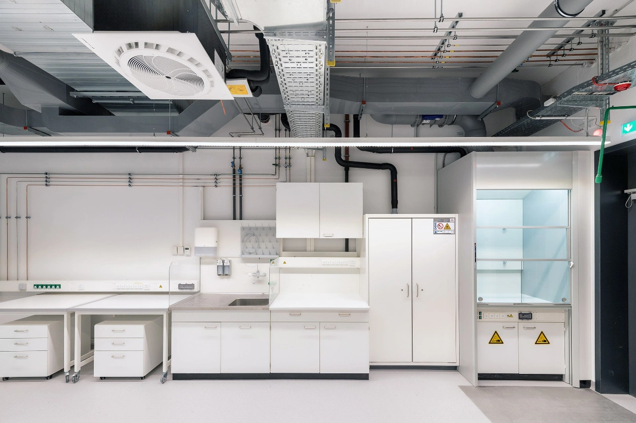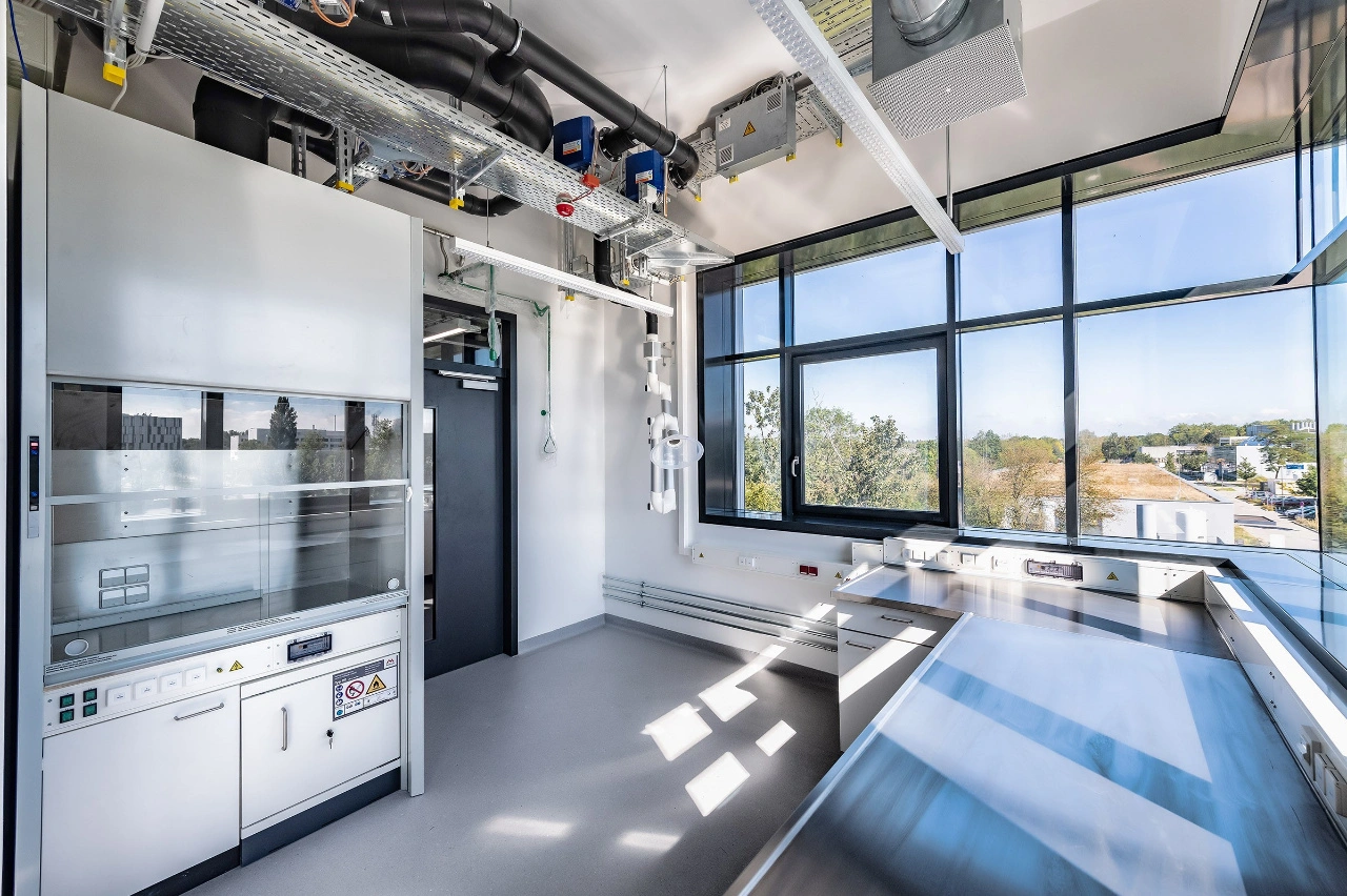 Vor allem bei der Gestaltung und technischen Ausrüstung der Labore für die unterschiedlichen Forschungsdisziplinen galt es, hochkomplexe spezifische Anforderungen aus der Proteinforschung zu berücksichtigen und fachgerecht auf über 3000 qm Laborfläche und 1,6 km Laborbench – also die Fläche aller Laborarbeitsplätze an einem Stück – zu realisieren. So war zum Beispiel der Anschluss aller Laborbereiche an eine Reinstwasseranlage nach neuestem technischem Standard erforderlich, um für ideale Forschungsbedingungen zu sorgen. Im physikalischen Labor im Erdgeschoss werden hochauflösende Analysegeräte eingesetzt, etwa ein Kryo-Elektronenmikroskop, Laser und weitere sehr schwingungssensitive High-Tech-Instrumente wie Spektrometer oder optische Fallen. Die hochempfindlichen Geräte reagieren auf kleinste Erschütterungen und registrieren sogar Schwingungen, wie sie ein LKW noch in 300 m Entfernung erzeugt. Um eine effektive Schwingungsdämpfung sicherzustellen, wurden alle empfindlichen Geräte durch Spezialfundamente von ihrer Umgebung entkoppelt. Für die hochinstallierten Biochemielabore zur Proteinforschung galt es, die Sicherheitsstufen 1 und 2 nach der Gentechniksicherheitsverordnung (GenTSV) zu realisieren und die Durchführung von Experimenten auch über Nacht zu ermöglichen. Deshalb wurden für den nötigen Brandschutz auch selbsttätige Kleinlöschanlagen in Laborabzügen installiert. Zum Schutz vor der elektromagnetischen Strahlung, die beispielsweise durch Kernspintomografie für Strukturanalysen von Flüssigproben in NMR-(Nuclear Magnetic Resonance)-Spektroskopie-Laboren entsteht, wurde zusätzlich zu den vorgeschriebenen Strahlenschutzmaßnahmen auf entsprechende Sicherheitsabstände und geeignete Nutzungsarten für benachbarte Räumen innerhalb des Gebäudes geachtet.